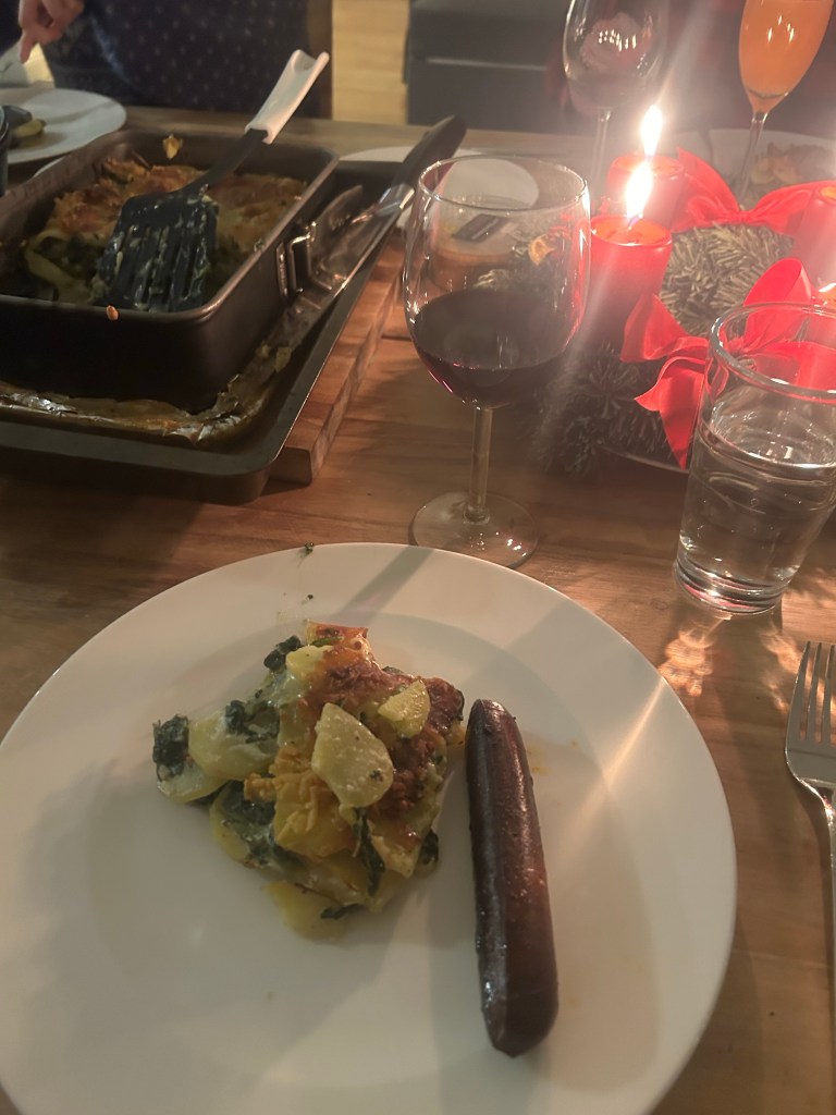 Der Nachmittag vergeht mit Kochen (hauptsächlich die beste Freundin des Liebsten mit Zuarbeit des Liebsten), Sekt trinken und erzählen. Dann gibt es einen Bellini zum Aperitif und dann veganes Kartoffel-Spinat-Gratin und vegane Chorizos, dazu Rioja, für die die Rotwein mögen (hauptsächlich ich).