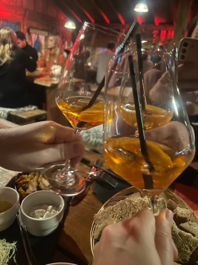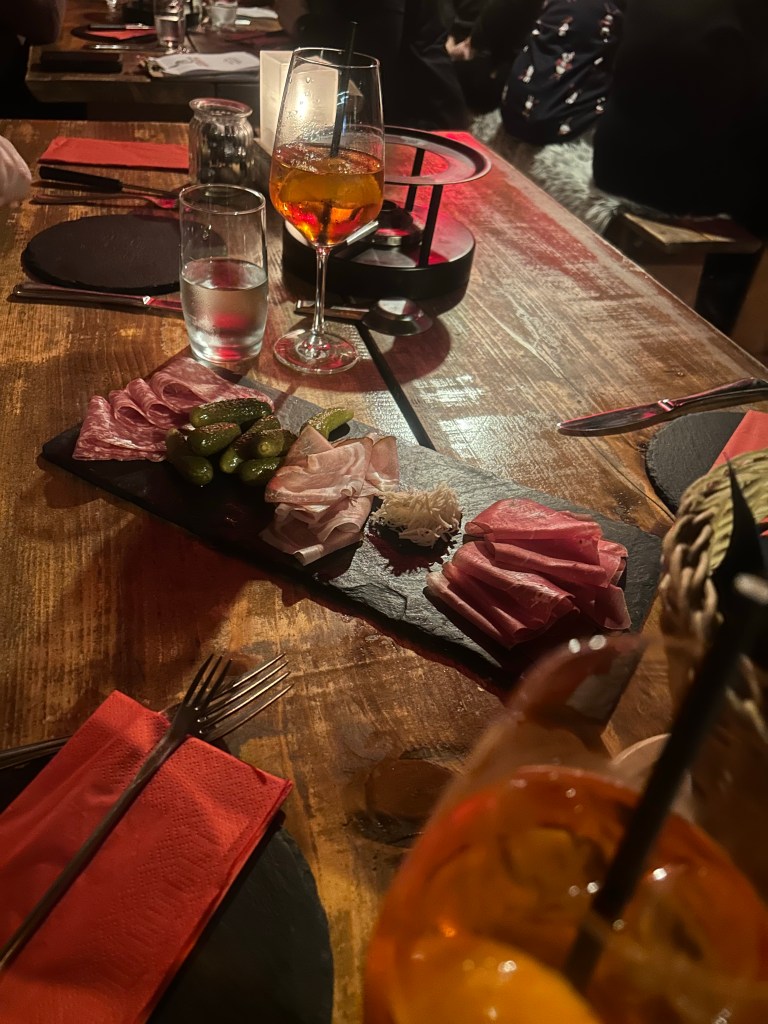 Um 17 Uhr mache ich einen frühen Feierabend und dann fahren der Liebste und ich mit der S-Bahn rüber nach Friedrichshain und treffen eine Freundin in einem hipsterigen Schweizer Fondue-Restaurant mit Skihüttenflair, irgendwo im Nirgendwo. Die Location ist skurril, das Essen ausgesprochen köstlich und die Gesellschaft natürlich herausragend gut. Es gibt eine Vorspeisenplatte mit Aufschnitt (Bühühündnerfleisch!!), Cornichons und Meerrettich, dazu Aperol Spritz. Zum Hauptgang teilen wir uns ein Käsefondue mit Trüffel und ein Fleischfondue, dazu Kartoffeln, Champignons, Brot, Dips und für mich Rivella. Zum Nachtisch gibt es Schokofondue mit Obst und Schnaps aufs Haus (für mich Birne).