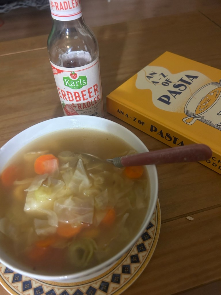 Nach dem ganzen Temperatur-Auf-und-Ab vom Wochenende fühle ich mich leicht anerkältet, deswegen koche ich mir jetzt eine schöne Suppe. Ob mich die italienischen Küchengötter strafen, weil ich ihre Tortellini in eine eher chinesisch-scharfe Gemüsebrühe mit Kohl, Sellerie und Möhren werfe? Wir werden es wohl herausfinden müssen. Beim Kochen telefoniere ich mit dem Liebsten und trinke nebenbei das letzte Erdbeerradler. Zum Essen höre ich mein Hörbuch zu Ende und kann Buch 6 auf meine Jahresliste setzen: Karin Smirnoff nach Stieg Larsson – Verderben.