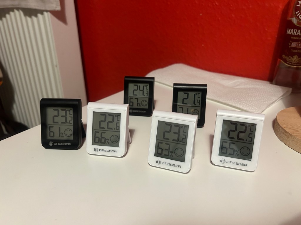 Zu dem Zeitpunkt sitzt schon seit zwanzig Minuten der ehemalige Mitbewohner in der Küche und unterhält sich mit dem aktuellen Mitbewohner über ihre jeweilige Arbeitssituation und die individuellen Besonderheiten der beiden Katzen. Dann bricht der Mitbewohner auf zu einer Verabredung und ich gebe dem ehemaligen Mitbewohnet seine Post und wir unterhalten uns über dies und das. Nebenbei packe ich die Hygrometer aus und stelle fest, dass keine Batterien dabei sind. Also begleite ich den Ex-Mitbewohner noch bei seinem Aufbruch – er lässt sich von mir dabei die aktuellen Anti-Nazi-Demonstrationen erklären („So what is the problem, why do people vote for AfD”?) und berichtet, wie schwer es geworden ist, als Nichtdeutscher Jobs in deutschen Unternehmen zu finden – in seiner Community ist man überzeugt, dass es eine Policy gibt, nur noch deutschsprachige Leute einzustellen…) – und gehe noch schnell in den Drogeriemarkt, Batterien kaufen. Die lege ich dann zuhause direkt ein und dann habe ich da sechs Hygrometer, die jeweils unterschiedliche Werte anzeigen.