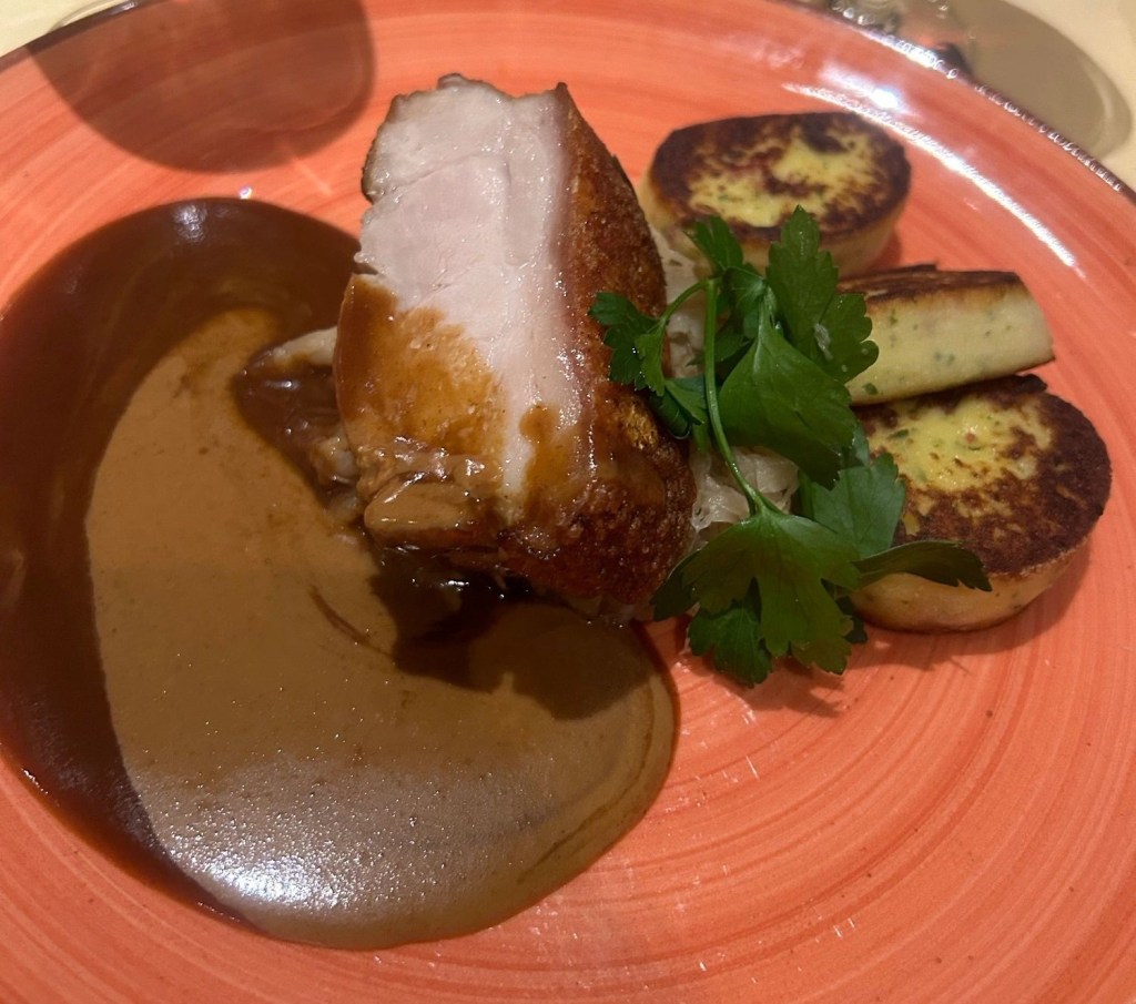 Pünktlich um 16 Uhr bin ich wieder oben im Bett – Teammeeting bis 17 Uhr. Da mein Anschlussmeeting ausfällt, erledige ich danach nur noch ein paar dringende Kleinigkeiten und klappe dann schon um 17:30 den Laptop zu und werfe mich in Schale – schickes rotes Kleid, schwarzer Blazer, Täschchen für die beiden Handys. Es gibt ein großes Hallo, als ich so wieder unten eintreffe, wo inzwischen auch eine Trauzeugin von vor 50 Jahren eingetroffen ist. Bald danach kommen mit einem Paar Tante+Onkel des Liebsten auch die letzten Gäst*innen für heute an (eine zweite Feier mit lauter Freund*innen und Kolleg*innen des Brautpaars findet am Wochenende statt). Wir verteilen uns an zwei Tische – einer für die Generation Ü80 (plus die 79jährige Trauzeugin) und einen für die Generation Ü40 plus die beiden Kinder und dann gibt es für alle über 11 Champagner. Es folgt ein leckeres mehrtägiges Abendessen (Salat mit Kartoffeldressing und Speck, Selleriecremesüppchen, Spanferkelrücken mit Champagnerkraut und Maccaire-Kartoffeln und zweierlei Schokoladenmousse mit Obst).