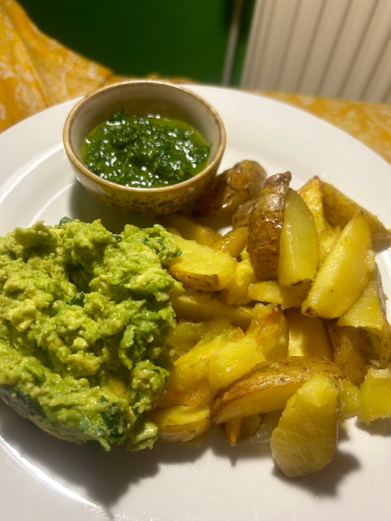 Ich mache mich an die Umsetzung der neuen Aufgaben, gebe zwischendurch Feedback, ziehe Daten, wühle im Archiv… Das 14-Uhr-Meeting wird erst nach hinten und dann auf morgen verschoben, weil die eine beteiligte Kollegin blöd gestürzt ist und erstmal zum Arzt muss. Das 17-Uhr-Meeting wird ebenfalls auf morgen verschoben. Das 18-Uhr-Meeting (mit Seattle, da ist es gerade erst 9) findet dann aber statt, ist zum Glück aber schnell vorbei. Ich schreibe noch schnell eine Mail und habe dann kurz vor halb 7 Feierabend. Zeit fürs Kochen. Ich mache mir wieder einen Podcast an, schnitze Kartoffelecken und werfe sie in den Ofen und mache mir dann eine Guacamole und Mojo verde dazu.