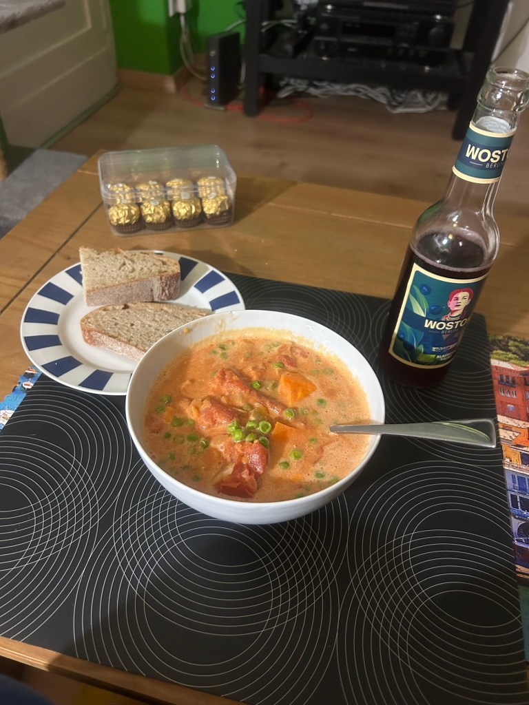 Ich setze mich kurz mit einer Feierabendlimo (Blaubeer-Salbei) auf die Couch und mache mir dann Abendbrot. Hoch lebe das Internet, ich finde ein passendes Rezept zu meinen Zutaten (Süßkartoffel, Erbsen) und mache mir eine Art asiatischen Gemüseeintopf daraus, mit Dosentomaten, frischer Limette, einem Rest roter Thai-Curry-Paste und Kokosmilch. Eigentlich hätte es mehr so ein Curry werden sollen, wurde dann aber flüssiger als geahnt. Mit Dinkelbrot dazu wird das ganze sättigend und weniger scharf.