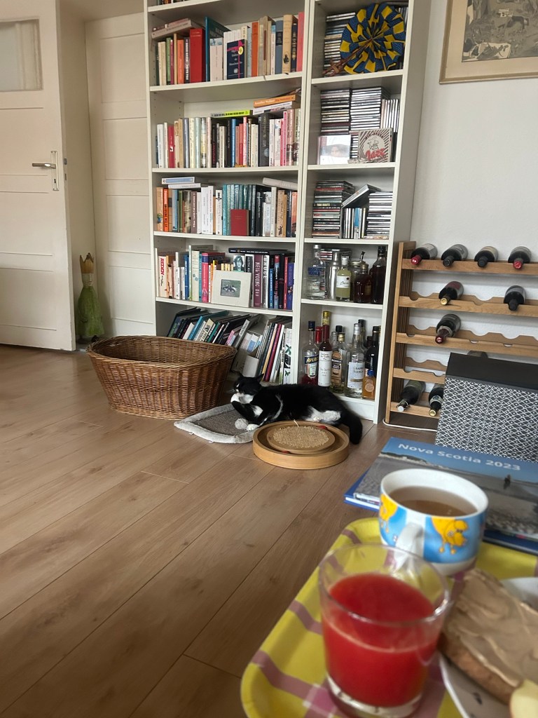 Als Nächstes schaffe ich rund ums Bett Platz, lege Wäsche zusammen und fummele die Sesselpolster zurück in den frisch gewaschenen Bezug. Kurz ausruhen. Dann trockne ich das Katzenklo ab und befülle es mit neuem Streu – es reicht nicht mehr für eine ganze Füllung, also muss ich hinunter in den Keller und neues hochholen. Als das Klo fertig ist, schnappe ich mir den Staubsauger und sauge die Wohnung gründlich durch – ich sage nicht, wann das das letzte Mal passiert ist, Teile der Antwort könnten meine Leserschaft verunsichern. Dann muss ich mich wirklich erstmal ausruhen. Inzwischen ist auch der Mitbewohner aufgestanden und wir treffen uns in der Küche beim Frühstück machen. Bei ihm gibt es Müsli, bei mir Toast mit Mandel-Tonka-Creme samt einem Apfel und Toast mit Gouda und Apfelmeerrettich samt einer Möhre, außerdem frisch gepressten Blutorangensaft und Sencha-Tee. Damit setze ich mich dann kurz nach 13 Uhr in den frisch bezogenen Sessel. Die Katzen sind verwirrt, da sitze ich doch sonst nie?? Es wird viel miaut und geguckt, aber keine setzt sich dazu, merkwürdig. Aber schön, dass ich zur Unterhaltung beitragen kann.