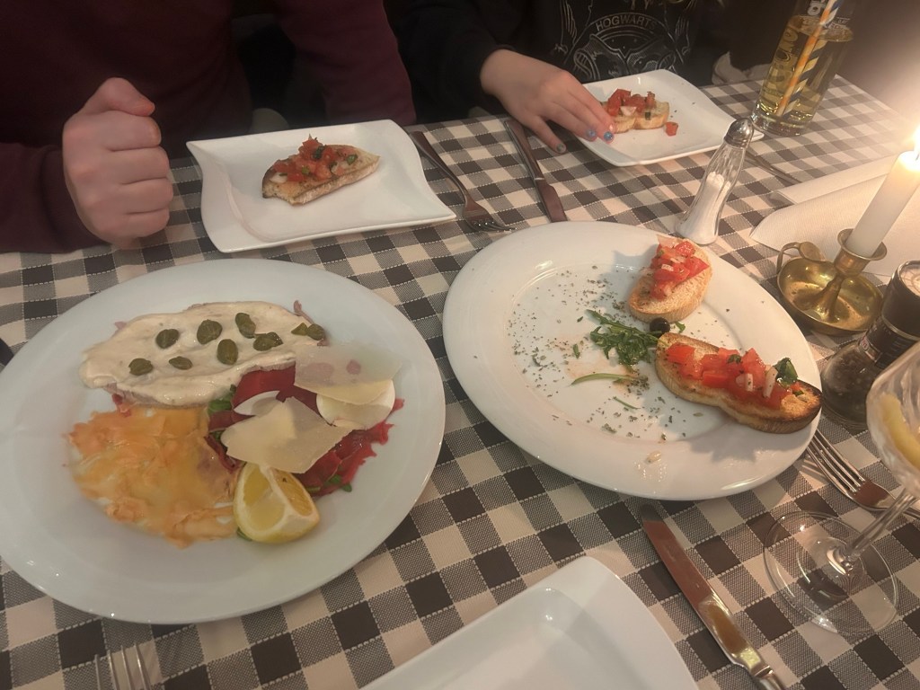Ja, die Meeresfrüchte sind ein Wagnis, aber wir verstehen uns mit den Betreibern des Restaurants so gut, dass sie mir schon nichts vorsetzen würden, was mich krank macht. Schön auch die Frage: „Willst Du das Original oder mit Tomatensauce?“ Die Antwort war wohl klar. Der Cattaratto dazu war leider ausverkauft, stattdessen wurde uns ein Ca‘ dei Frati empfohlen, der auch sehr lecker war. Während des Essens baut das leicht angeschlagene Teilzeitkind spürbar ab. Eine halbe Pizza bleibt übrig und Eis wird verweigert, also verzichte ich auch auf Dessert (nächstes Mal dann aber die Zabaione!) und wir bezahlen schnell und gehen heim. (Auf die traditionellen heimlichen Süßigkeiten zum Abschied verzichtet das Teilzeitkind natürlich keinesfalls, das Versteckspiel vor uns gehört schließlich zum Ritual und man kann ja nie genügend Süßigkeiten auf Vorrat haben). Auf dem zweiminütigen Heimweg kuschelt es sich dann aber zitternd an mich und verschwindet zuhause direkt im Bett.