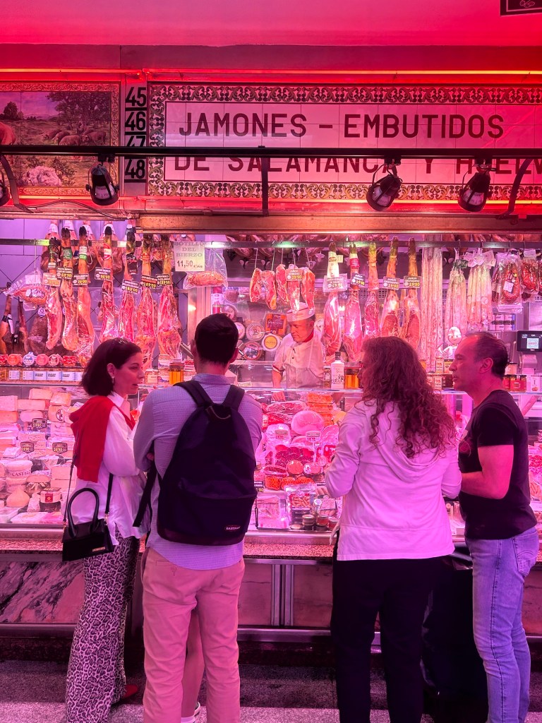 Am Stamm-Fleischstand in der Nachbarschaft gibt es Jamón zu verkosten und meine Gastgeberin kauft Verschiedenes als Mitbringsel für ihre Eltern, die sie zu Ostern besuchen wird. Dann laufen wir weiter durch die Innenstadt und über die Plaza Major.