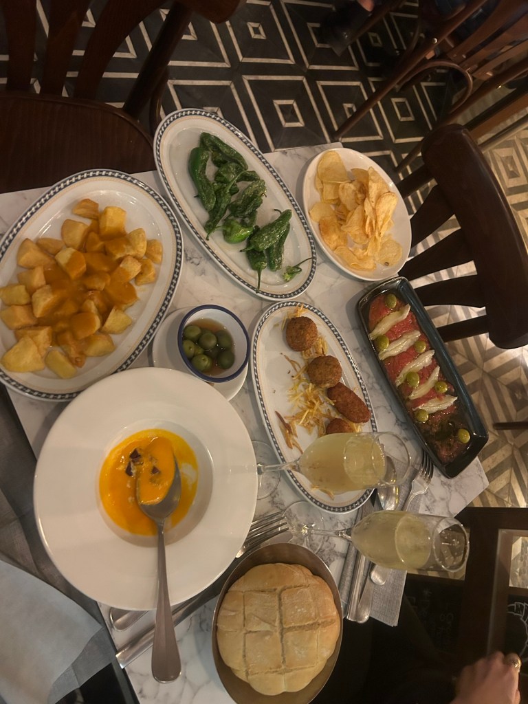 Es gibt Salmorejo mit Schinkenstreifen, Patatas bravas, Croquetas mit Schinken und Spinat, marinierte Anchovis auf Kartoffelchips, Pimientos de Padron, Oliven und Brot, dazu Cava. Zum Nachtisch teilen wir uns einen Flan und gegrillte Ananas mit Kokoseis.