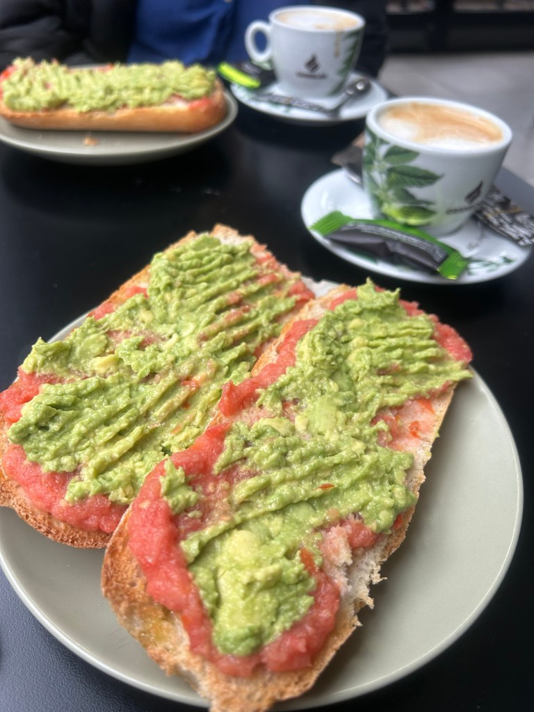 Gegen 10:30 gehen wir gemeinsam Frühstückspause machen (spanischer Tagesablauf), trinken in einer Cafeteria nebenan einen café con leche und essen Brot mit Tomate und Avocado.