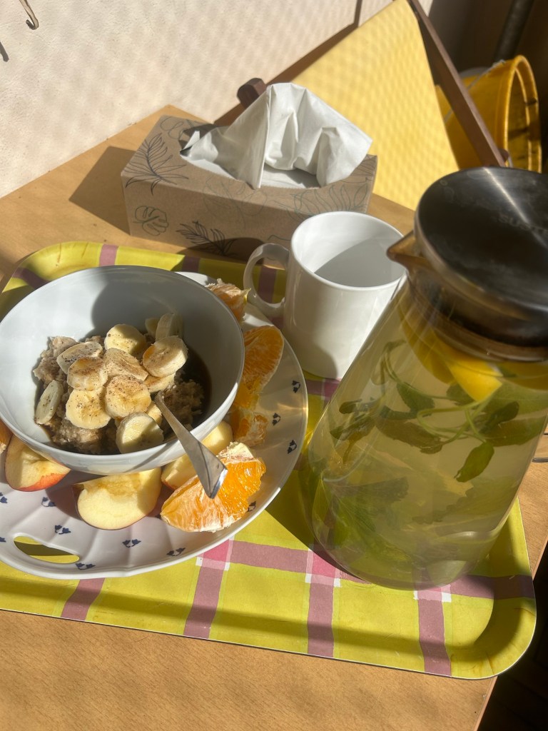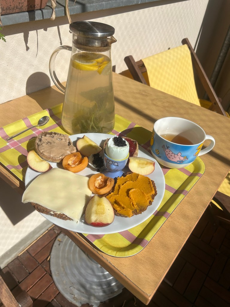 Wir sind nach meiner Rechnung am dritten Bleibetag der Erkältung, ab morgen sollte sie gehen, aber mal sehen, was hält sich dieser Tage schon an Regeln. Angesichts von dringenden Arbeitsdingen, die nur ich tun kann, beschließe ich, trotz allem zu arbeiten – vom Bett aus – und es dabei mit Ankündigung ruhig angehen zu lassen. Dabei hilft, dass nach Verschiebung des Team-Meetings auf morgen heute nur zwei Meetings anstehen. Ich gehe unter die Dusche, mache mir wieder Balkonkräutertee mit Honig und Zitrone, Müsli mit Apfel und dann geht es los.