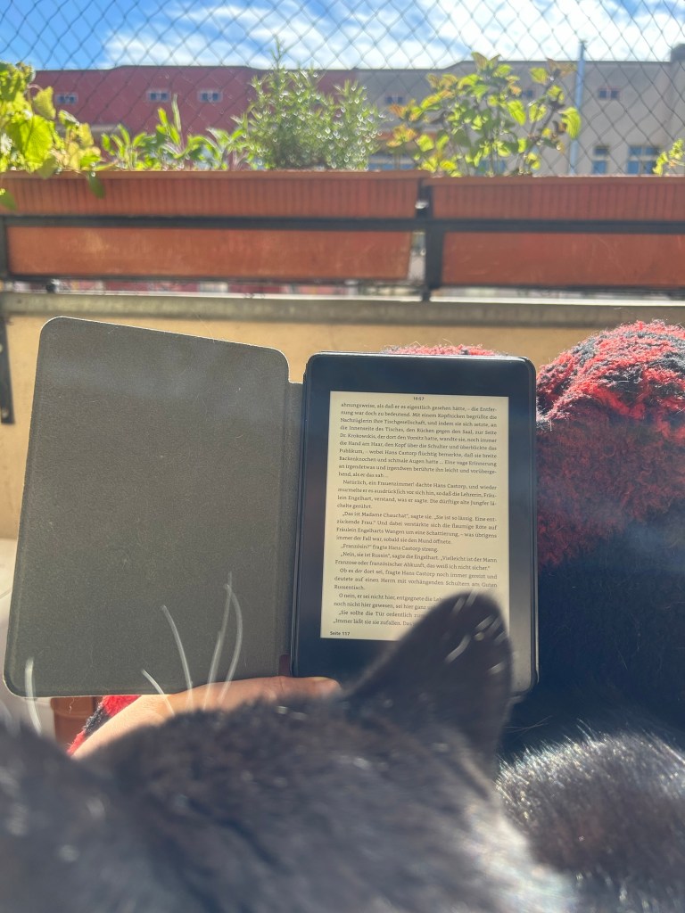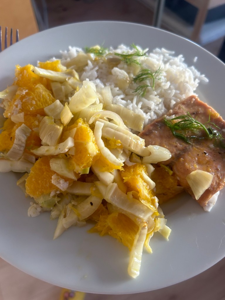 Ein bisschen Kleinkram hier und da, viel schriftliche Abstimmung mit Kolleg*innen und Arbeit an mehreren größeren Projekten, die demnächst fällig werden. Dazwischen ein Meeting mit Berlin (Lichtenberg, Pankow und Reinickendorf), Hamburg und Valencia und später eines mit London, beide mit Kamera aus und viel Husten, Niesen und Schniefen meinerseits. In der Mittagspause mache ich die Lachs-Orangen-Fenchel-Reste von gestern warm, dazu wieder Reis, von dem noch übrig ist – ein Ansatz fürs morgige Essen, das noch in den Sternen steht. Die kleinen Abenteuer des Alltags. Gegen 17 Uhr mache ich dann einen frühen Feierabend und starte in den ohne-Arbeit-Rumliegen-Teil des Tages.