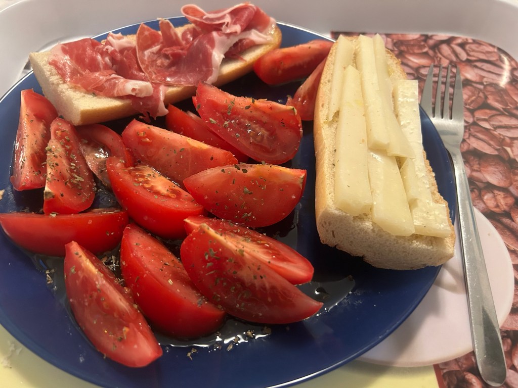 Hier geht es erstmal schnell ins warme Bett zum Aufwärmen (und direkt wieder einschlafen). Gegen halb 6 snacke ich eine Banane und fange das nächste Buch an: Charmaine Wilkerson – Black Cake. Kurz vor 8 werde ich wieder hungrig und mache mir Abendessen. Es gibt Brot mit Olivenöl, Iberico-Schinken, halbgereiftem Käse und Tomate.