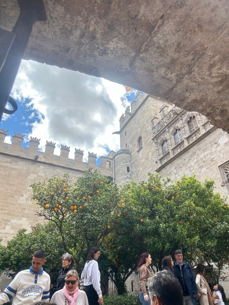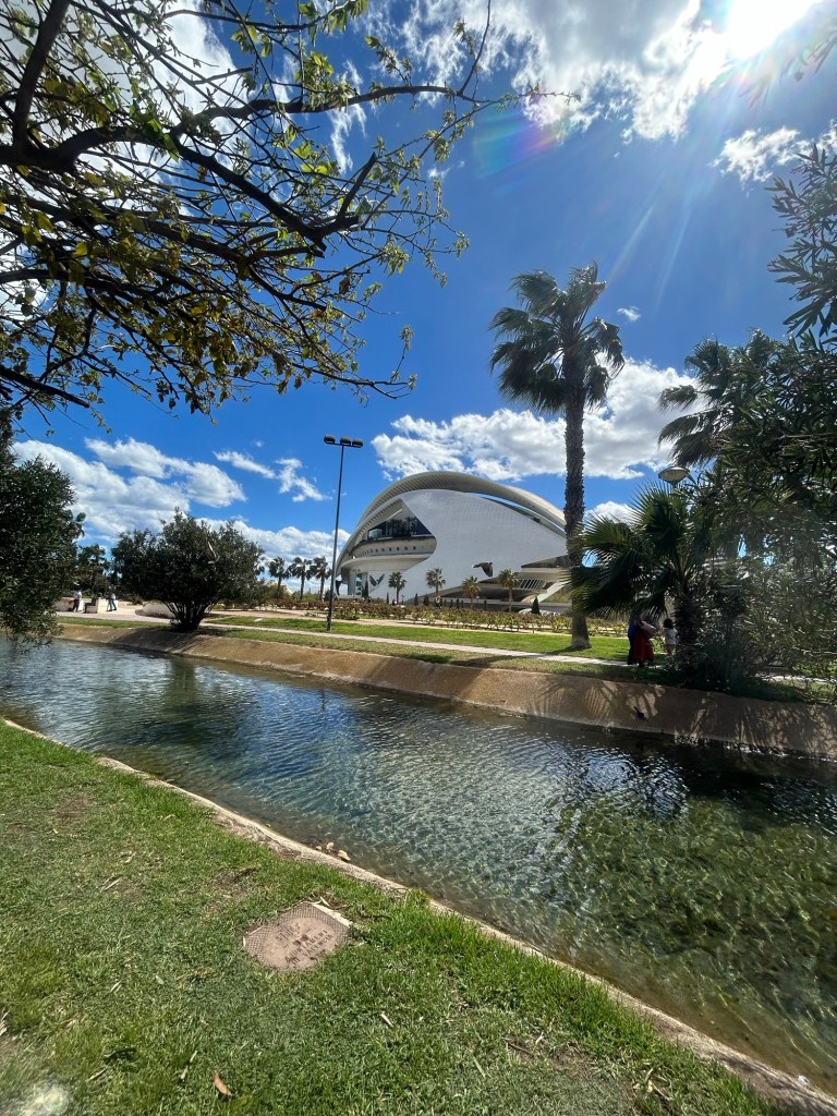 Nach dem Essen laufe ich hinüber in den „Stadtpark“. Nach einem schweren Hochwasser in den 50ern hat man den Fluss Turia um die Stadt herumgeleitet und aus dem Flussbett einen Park gemacht, der die gesamte Innenstadt durchzieht. Neben reinen Grünanlagen gibt es hier Gartenbereiche, Sportmöglichkeiten, Landschaftsgarten, Community Gardens und Kulturbetrieb jeglicher Couleur – und immer wieder Orangenbäumen. Ich spaziere von der Altstadt bis fast ans Ende, wo die großen Museen der Stadt sind. Unterwegs mache ich eine Pause mit Mandarinen-Granizado und Fartons am (künstlichen) Flüsschen.