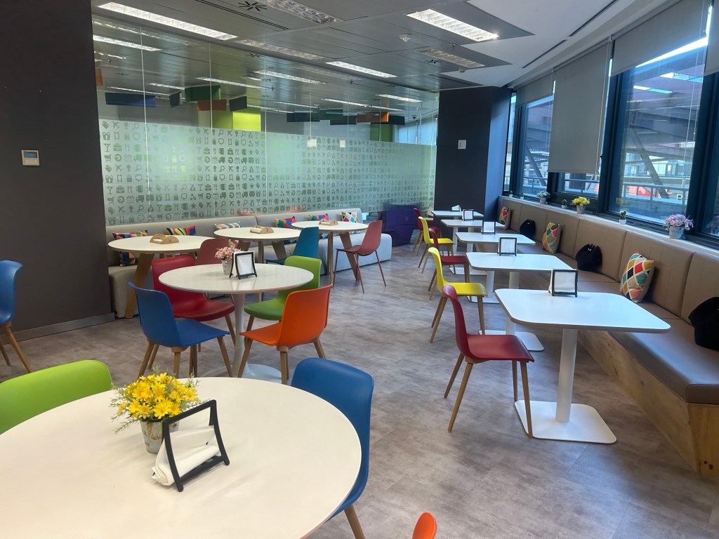 Ich erledige typische Monatsanfangsaufgaben: einen Newsletter versenden, die Firmenjubiläen im Intranet aktualisieren, Nutzungsdaten des Intranets vom Vormonat ziehen, aufbereiten und verteilen… Um 11 dann das erste Meeting, mit dem Berliner Büro, Biesdorf und Ostfriesland, für das ich mich in einen der Meetingräume zurückziehe. Die sind allesamt nach spanischen Malern (kein Gendern nötig) benannt und es hängt drinnen jeweils ein Druck eines ihrer Werke. Eigentlich habe ich El Greco gebucht, aber Mirò ist von der Ausstattung her passender und so buche ich um, auch für das Nachmittagsmeeting. Zur Mittagspause um 14 Uhr hole ich mir mit einer Kollegin eine Etage weiter unten ein Pad Thai (spanische Küche ist im Food Court eher nicht angesagt) und dann essen wir gemeinsam mit den beiden Neustarterinnen in der Küche. Die beiden werden genau wie die Kollegin auch für den deutschen Standort arbeiten und wir reden dementsprechend Deutsch.
