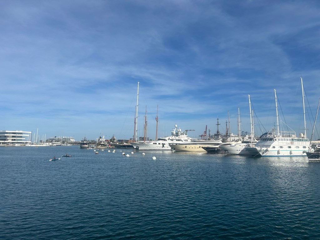 Erst durchs verschlafene Fischerdorfviertel, dann wieder die laute lange Straße entlang – unter Palmen und Orangenbäumen – bis zum Büroturm an deren Ende. Halb 9 bin ich da und treffe direkt unten auf einen Kollegen. Wir fahren gemeinsam hoch und ich setze mich heute mit an seine Schreibtischinsel. Heute am Freitag sind sehr wenige Leute da, die beiden Neuen und der Kollege, der sie einarbeitet, und ein anderes Team, das als einziges am Freitag den Bürotag hat. Dafür sind heute 80% der Anwesenden deutschsprachig, was irgendwie ungewohnt ist nach den letzten beiden Wochen.