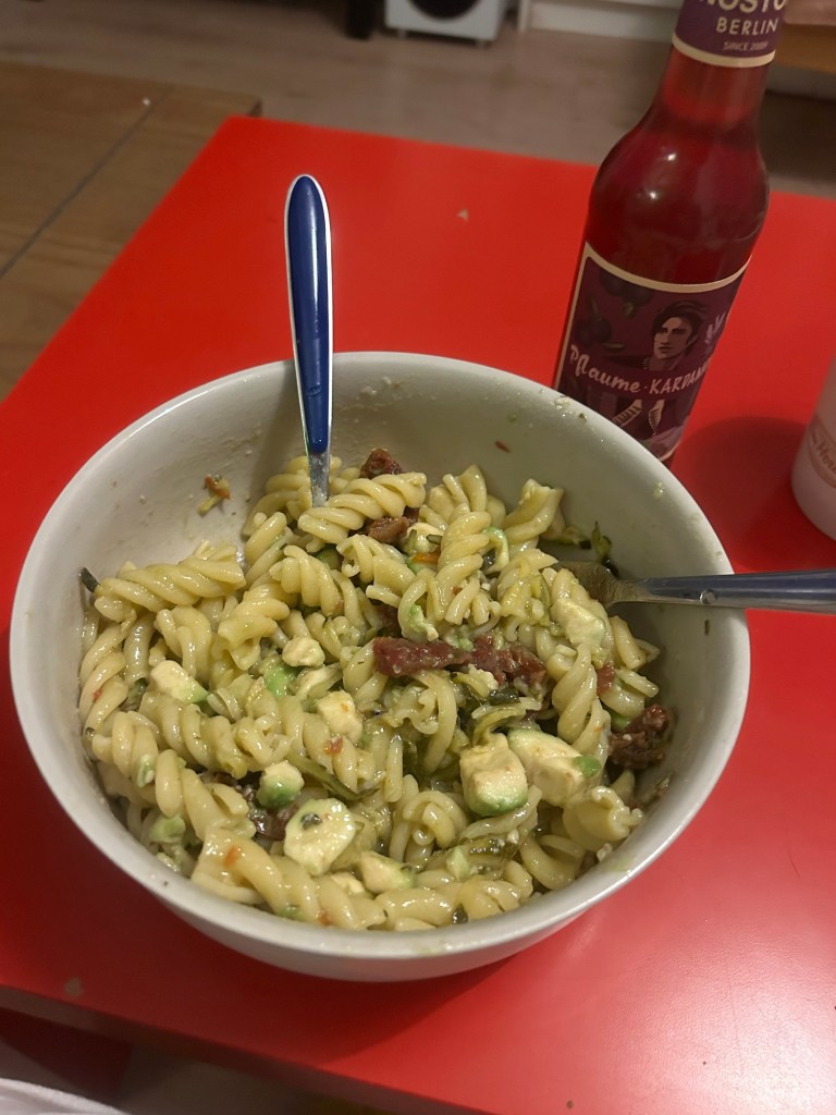 Die Pasta gibt es sommerlich, als lauwarmen Nudelsalat mit Avocado, getrockneten Tomaten, eingelegten Zucchini und Parmesan, dazu eine Feierabendlimo.