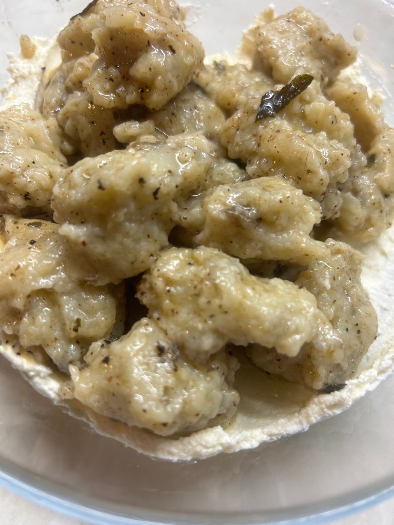 Reinstes Aprilwetter also, passt ja ausnahmsweise zum Kalender. Nach einer kurzen Verschnaufpause stelle ich mich dann in die Küche und koche nach diesem Rezept Topinambur-Gnocchi mit einer Knoblauch-Salbei-Butter. Der letzte Topinambur von der Hasenmama muss endlich verbraucht werden, den Salbei habe ich ja jetzt wieder frisch vom Balkon und den Rest eh immer da. Statt dem Ricotta gibt es wie gesagt Frischkäse, was auch erstaunlich gut schmeckt, mit Ricotta stelle ich es mir aber noch raffinierter vor. Einzig die Konsistenz des Teiges kriege ich nicht so hin, dass man ihn in Gnocchi-Form bringen könnte, stattdessen steche ich mit einem Löffel Nocken (höhö) ab, das funktioniert auch erstaunlich gut.
