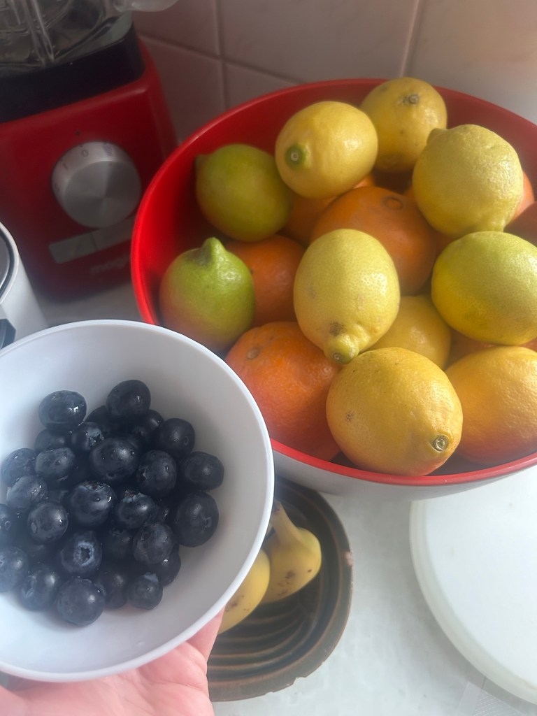Dann klingelt auch noch der DHL-Bote und bringt drei Pakete für mich und eins für einen Nachbarn. Gutes Timing! Das CrowdFarming-Paket mache ich gleich auf. Es gibt Orangen, Zitronen und Blaubeeren, von denen wir uns direkt zum Nachtisch bedienen.
