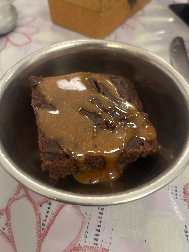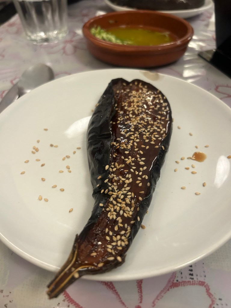 Marinierte rohe Zucchini auf BrotGegrillte Aubergine mit Honig und SesamReis mit Zeug und SeidentofuGlutenfreier Brownie mit Karamell
