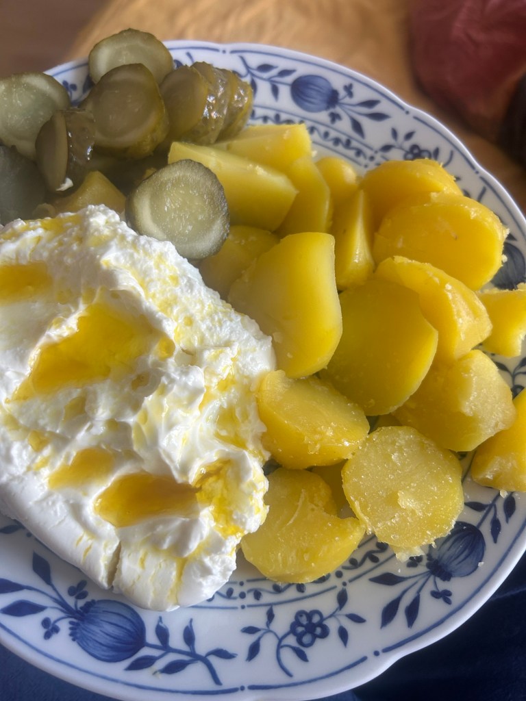 Der Film ist gut, aber zwischendurch schlafe ich ein – Mittagsschlaf zwischen Frühstück und Mittagessen. Am Ende des Films gucke ich das mir fehlende Stück (etwa 20 Minuten) nochmal nach. Danach habe ich wirklich Mittagshunger und während ein großer Teil meiner Familie sich zu einer Feier in einem sorbischen Restaurant trifft, mache ich mir passend Pellkartoffeln mit Quark und Leinöl und sauren Gurken.
