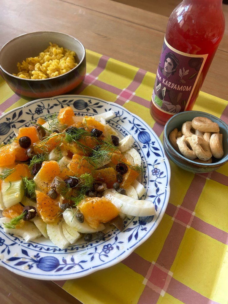 Wieder zuhause mache ich mir Abendbrot – Fenchel-Blutorangen-Salat mit Oliven und Kapern, dazu Taralli, eine Probierportion Safran-Risotto vom Mitbewohner und eine Pflaume-Kardamom-Limonade zur Feier des Abends.