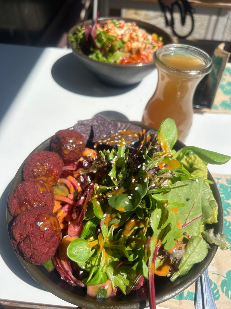 Ich bin dann um 10 im Büro, drehe eine Begrüßungsrunde, kippe mir Milch ins mitgebrachte Müsli und habe beim Essen ein erstes Brainstorming mit einem Kollegen. Dann gehe ich die E-Mails im Detail durch und beantworte, was zu beantworten ist. Danach langes Meeting zu viert vor Ort und mit Ostfriesland zugeschaltet. Nochmal E-Mails und dann ist es Zeit fürs Mittagessen. Mit zwei Kolleg*innen und einem Hund laufe ich bei strahlendem Sonnenschein und 25 Grad zum Poké-Bowl-Laden und bestelle mir eine mit drei Sorten Rote Bete (Falafel, eingelegt und als Chips), Guacamole und Erdnussdressing, dazu hausgemachten Eistee.