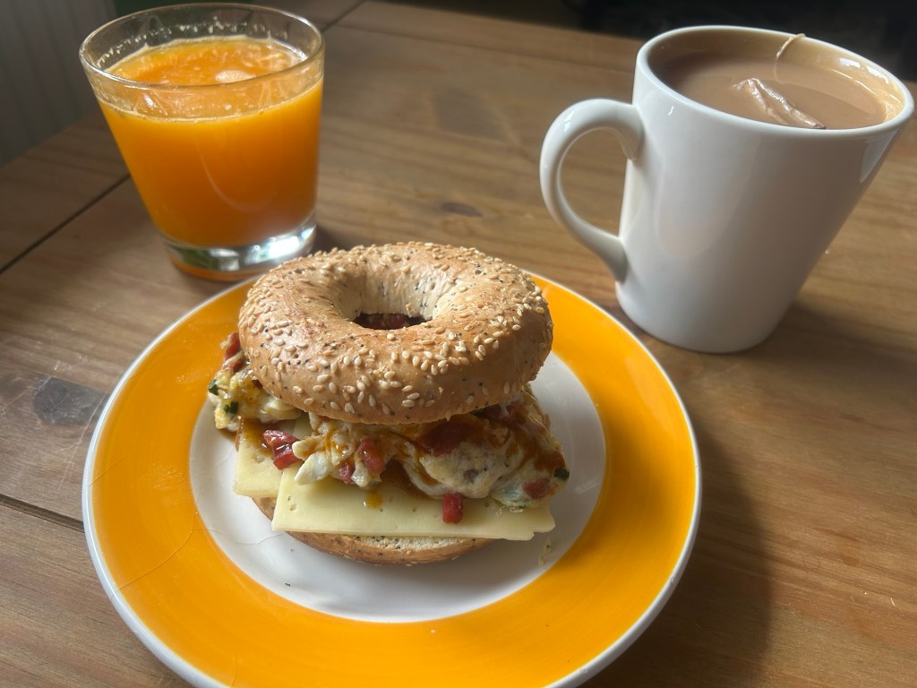 Mein Geisteszustand ist heute wunderbar ausbalanciert, angesichts der Weltlage kann man das ruhig mal erwähnen und feiern. Entspannter Morgen im Bett mit den üblichen Verrichtungen – Internet leer lesen, Bloggen, Französisch, Italienisch, Rätseleien – und dann mache ich mir erstmal Frühstück. Es gibt frisch gepressten Orangen-Mandarinen-Saft, eine cuppa tea mit Milch und den letzten Bagel mit Käse, Rührei mit veganem Schinken und Schnittlauch und etwas Gewürzketchup.