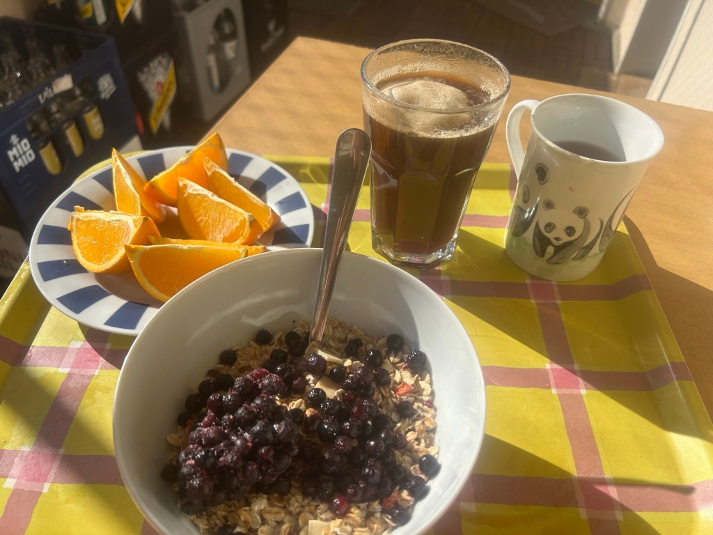 Morgens im Bett still Sachen machen ist was ganz anderes, als wenn als Reaktion auf die Sachen plötzlich schon kurz nach 8 der Bruder anruft und man dann ganze Sätze sprechen soll, mit Artikulation und allem. Routine im Eimer, aber immerhin erfahre ich so von einer Quarkkeulchen-Möglichkeit, die ich im Laufe des Tages zu einer Tatsächlichkeit manifestieren kann. Erst aber zurück in die normale Routine und mit dem Liebsten telefonieren, Französisch lernen, Italienisch lernen und irgendwann Katzen füttern und frühstücken – auf dem Balkon, solange die Sonne drauf scheint.