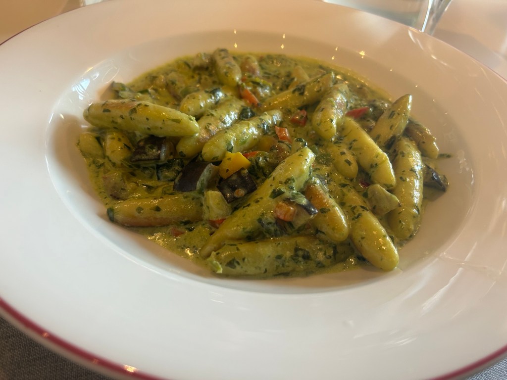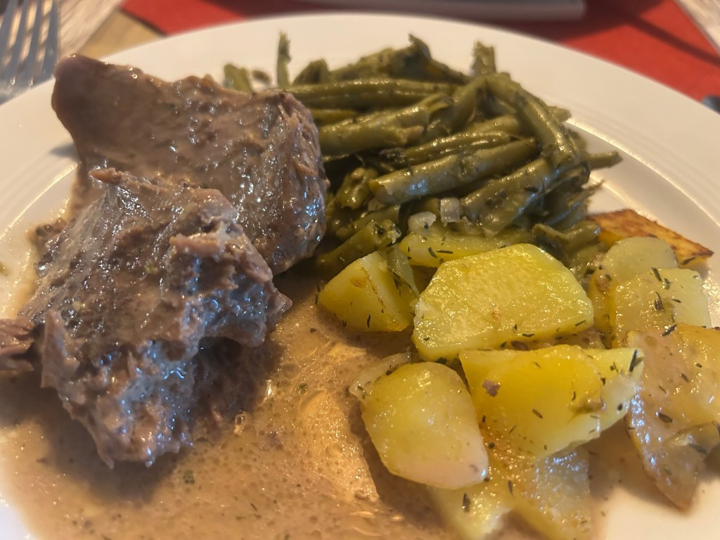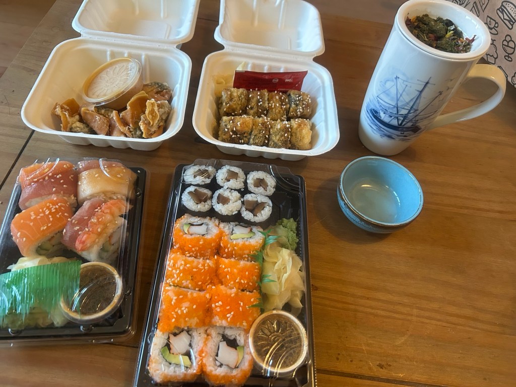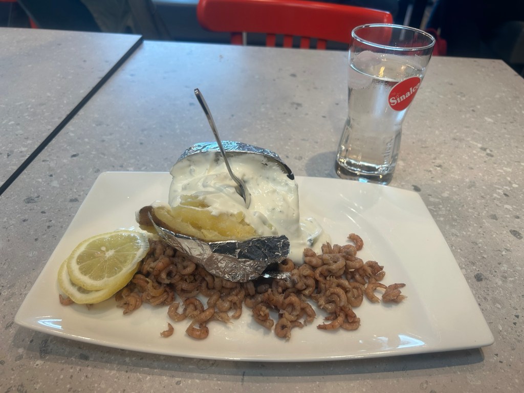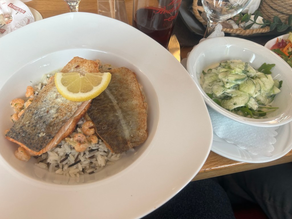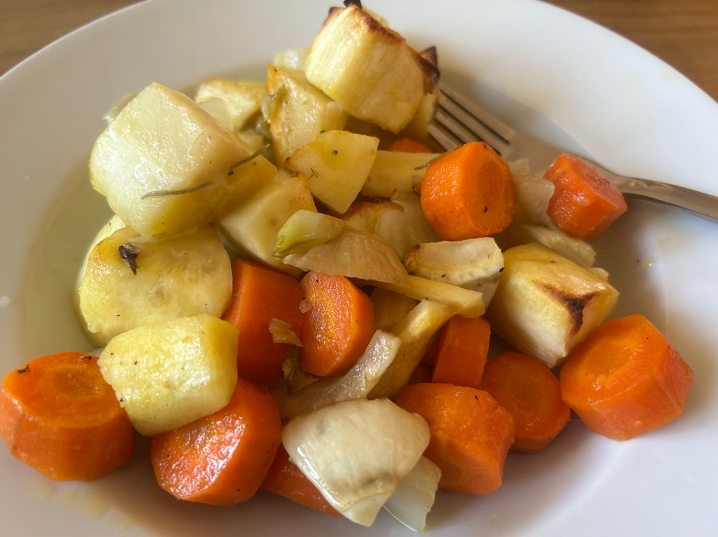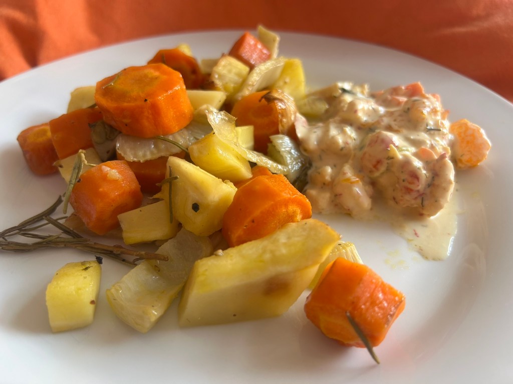 Zum Mittag (und auch zum Abendessen) gibt es Reste, es ist noch Ofengemüse, dazu eine schon abgelaufene Packung Flusskrebssalat, die ich aus Neugierde gekauft hatte. Schmeckt lecker.