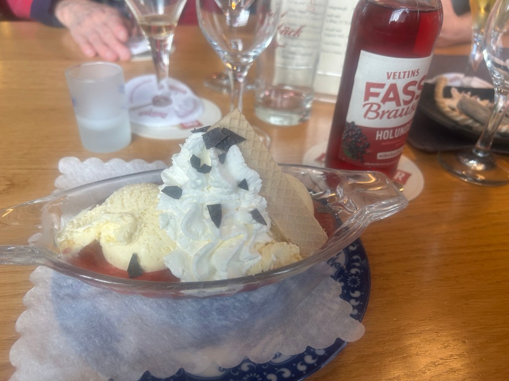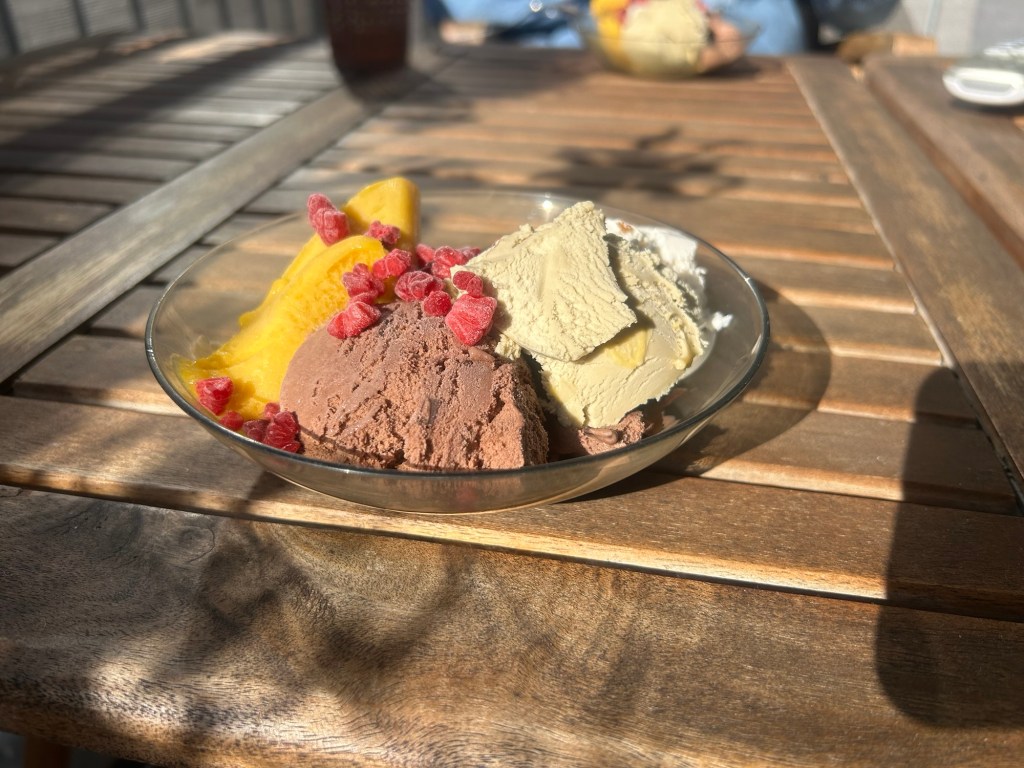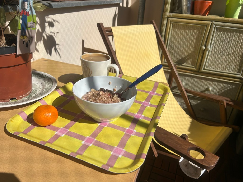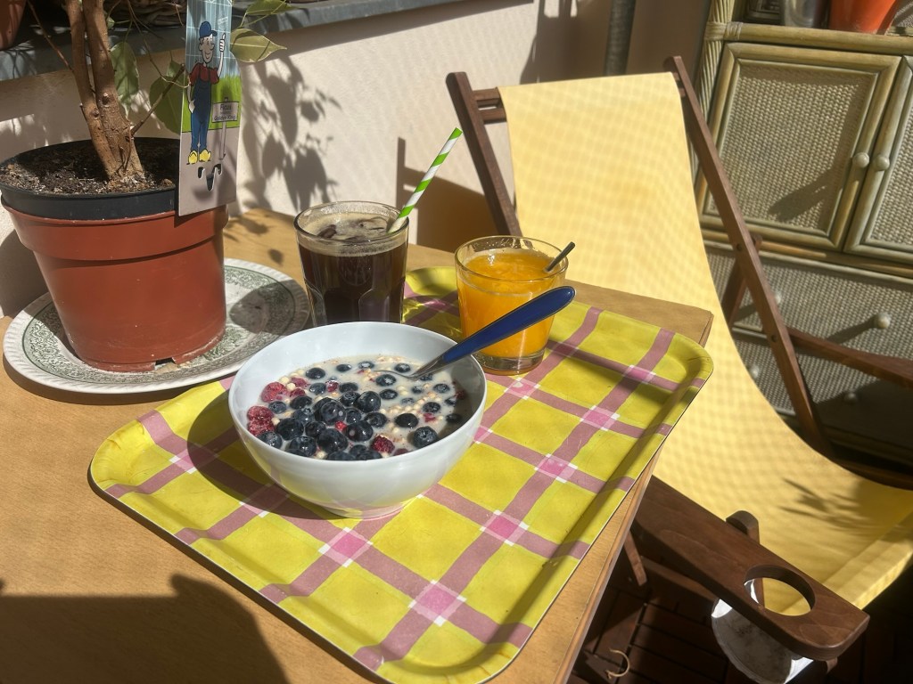 Zum Glück habe ich heute wenig Verpflichtungen, nach dieser Nacht bin ich äußerst matschig und lasse es ruhig angehen. Zum Frühstück gibt es Crowdfarming-Orangen und -Blaubeeren (im Getränk bzw. im Müsli) und dazu Espresso Tonic auf Eis – dann ist das Tonic rechtzeitig alle, bevor heute Abend die neue Getränkelieferung kommt.