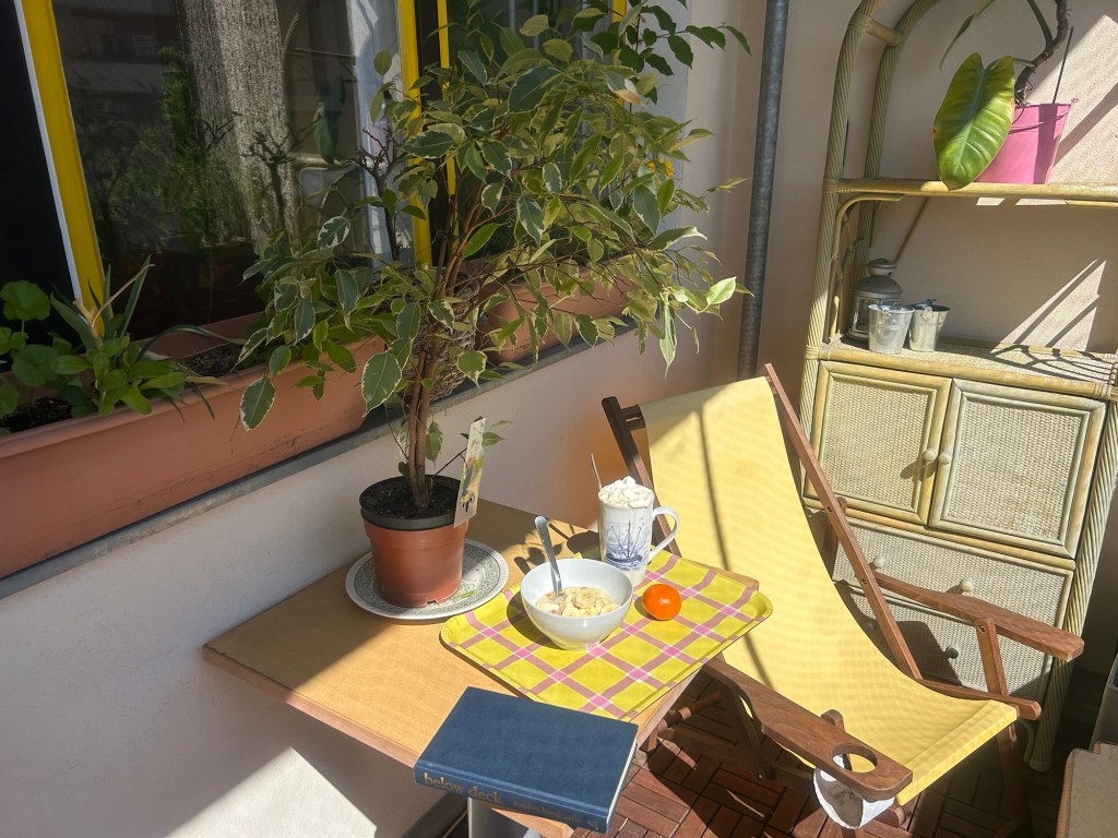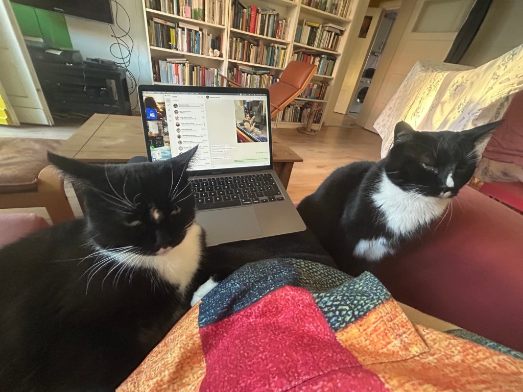 Ich verbringe den Vormittag auf dem Balkon, erst mit den üblichen morgendlichen Dingen, dann bei einem Online-Workshop. Die Sonne ballert wieder, so dass Nimbin seinen Kopf extra in den Schatten legt, während er ihr den Bauch entgegen streckt.