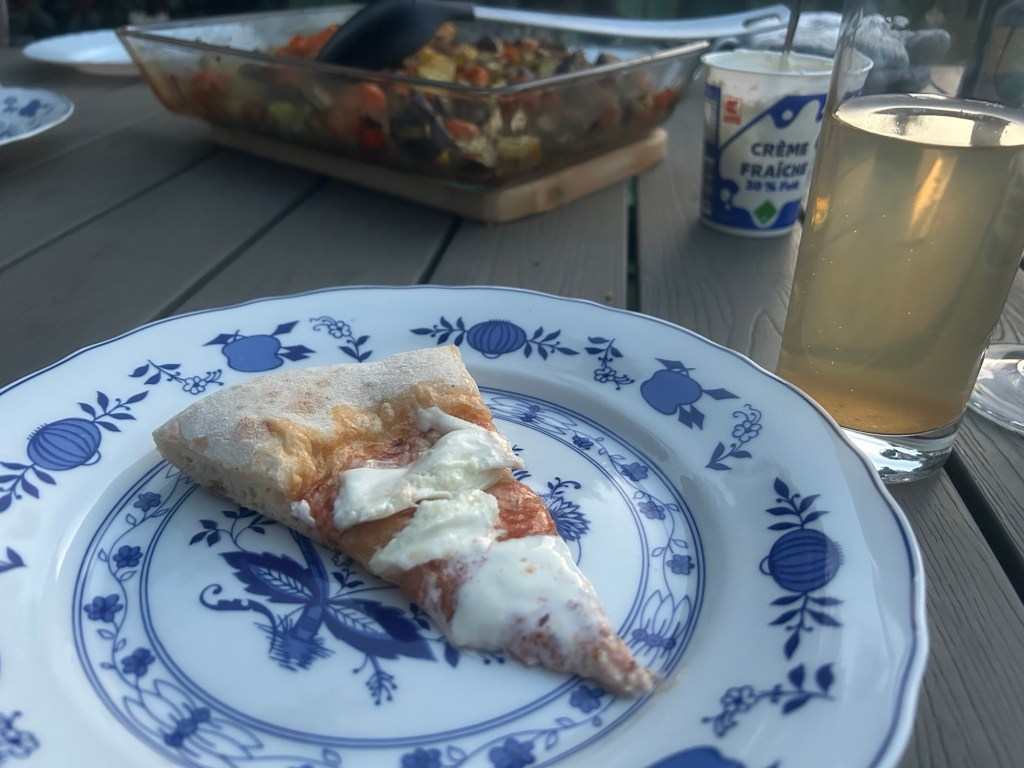 Der Ofen ist noch vom morgendlichen Brotbacken warm, wird dann aber nochmal mit mehr Holz auf Hochtouren gebracht, während nach und nach die anderen Gäste eintrudeln. Eine Fermentationsspezialistin hat zwei Sorten Pizzateig mit Sauerteig mitgebracht – eine für den herzhaften Teil und eine für die Nachtischpizza (mit selbstgemachter Nutella und Apfelmus). Außerdem Burrata. Wir trinken Cynar Spritz und andere Getränke (spät am Abend sogar noch Nascetta) und als es langsam dunkel wird kommen die ersten Pizzen aus dem Ofen.