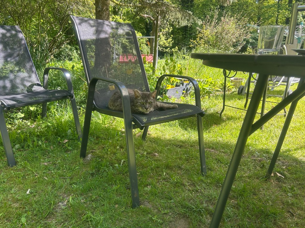 Dann löst sich die Gesellschaft langsam auf. Vier brechen auf Richtung Heimat, eine geht Tapeten ablösen, einer geht Gartenarbeit nach. Mein Fuß und ich bleiben sitzen, ebenso wie die Musicousine und das lokale Katertier. Es ist viel Chillens und Erzählens und ins Grüne guckend Sinnierens.