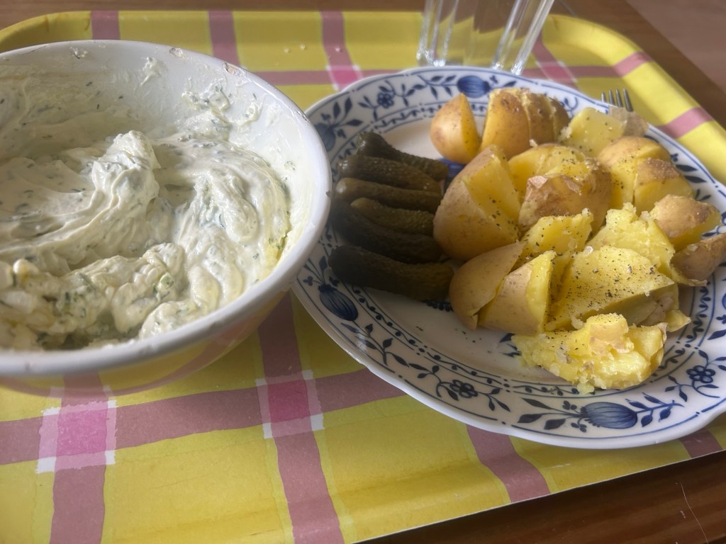 Zum späten Mittagessen gibt es dann Pellkartoffeln, Cornichons und Kräuterquark mit Leinöl allem, was Balkon und Tiefkühlfach so zu bieten haben (außer Koriander und Rosmarin): Dill, Schnittlauch, Basilikum, Thymian, Petersilie, Liebstöckel, Estragon, Minze, Zitronenmelisse und Salbei. Dann kümmere ich mich endlich um meine Französisch- und Italienischlektionen, heute Morgen war ja keine Zeit.