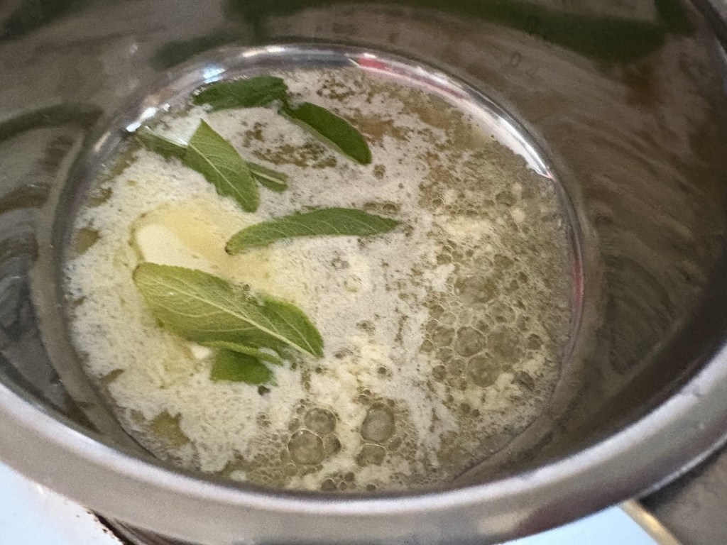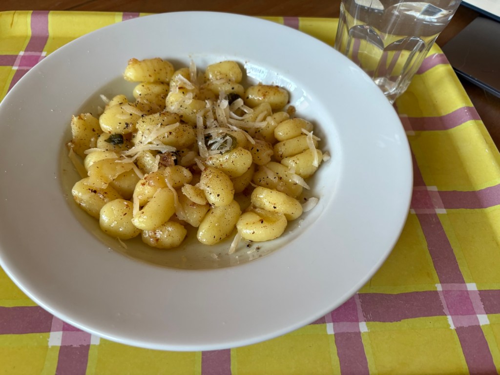 Zwischendrin mache ich mir noch Abendbrot – es gibt Gnocchi (fertige, nicht mal aus dem Kühlregal, aber aus ursprünglich rohen Kartoffeln) in Butter und Balkon-Salbei, verfeinert mit Knoblauch, Peperoncini, Pfeffer und Parmesan.