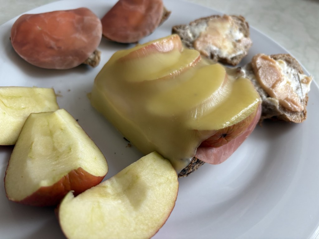 Ich verräume die Einkäufe, schneide das frische Brot in Scheiben, friere diese ein und mache mir aus den Kanten und dem letzten Stück eingefrorenen Brot ein Mittagessen. Grillschnitte mit veganem Lachsschinken, Apfel und Gouda, Stulle mit veganem Lachsschinken, Stulle mit Kaviarcreme.