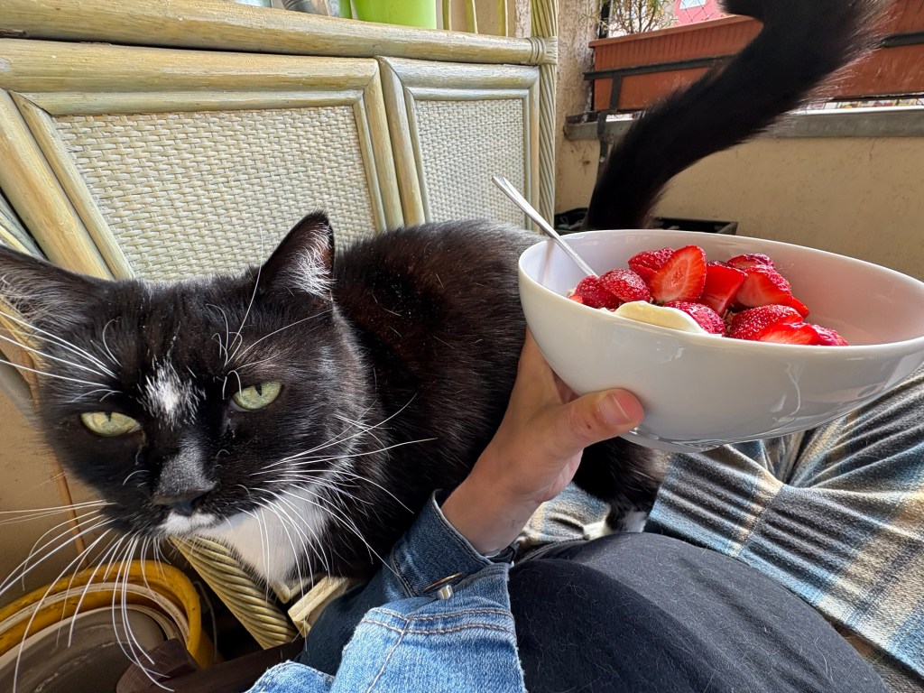 Die Katzen wieder früh wach ob des Lichts, ein Vorsatz zur Verdunkelung der Balkontür im Schlafzimmer wird gefasst und – Spoiler – im Laufe des Tages durchgeführt. Ich absolviere die morgendlichen Tätigkeiten bis einschließlich Bloggen im Bett und bereite dann erstmal Frühstück zu. Es gibt Müsli (Mango-Maracuja) mit einem Rest Joghurt und frischen Erdbeeren, dazu Weißen Tee mit Himbeeraroma und zusätzlichen TK-Himbeeren – in einer großen Kanne mein Getränk für den Tag. Erst setze ich mich mit dem Frühstück auf den Balkon, aber mit Wolken und Wind ist es dort heute tatsächlich zu kalt.