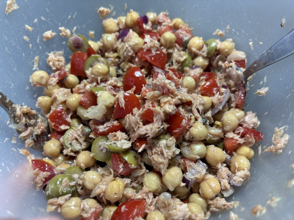 Kichererbsen, Thunfisch, Tomate, rote Zwiebel, Oliven, Kapern, Zitrone, Olivenöl, Oregano, Pfeffer, Paprika edelsüß