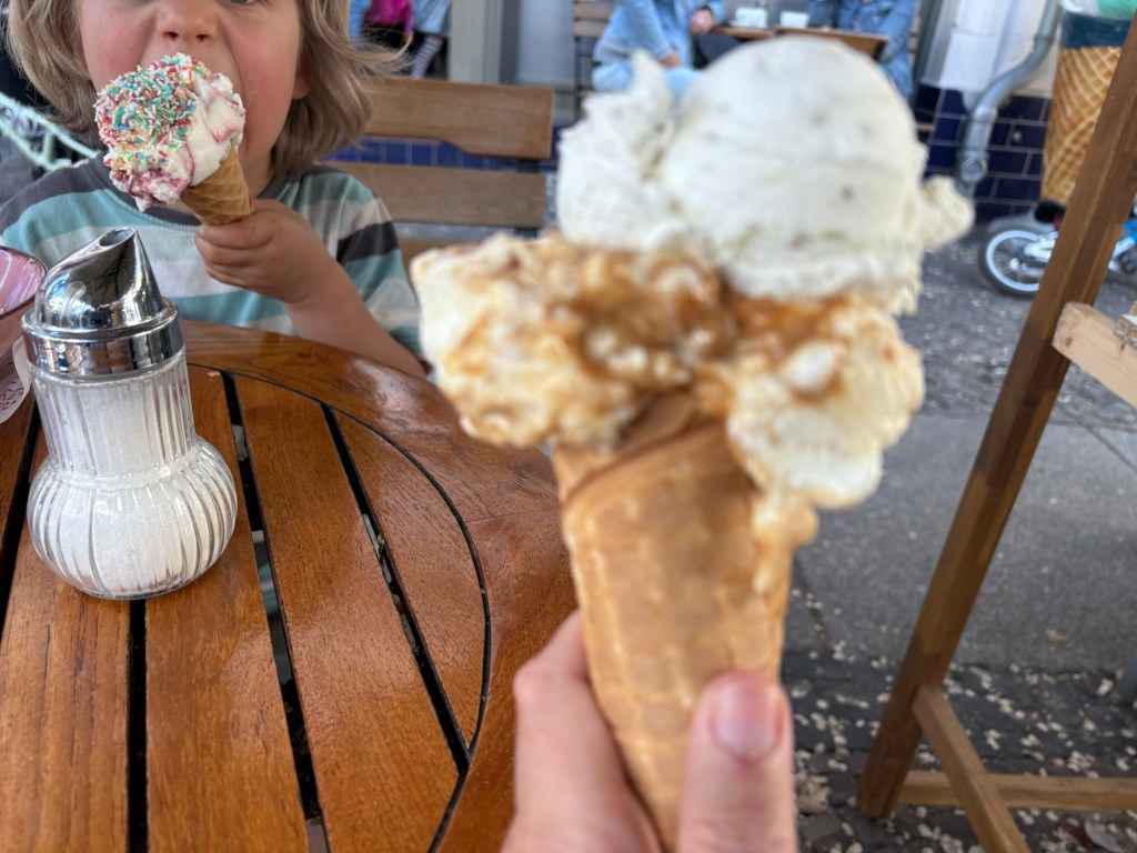 Ich nehme zwei Kugeln, die Freundin nur eine, die Kinder jeweils auch, aber mit Streuseln. Ich fühle mich kurz schlecht, weil die Freundin nur eine hat, sehe aber schnell wie sie neben der eigenen Kugel ständig parallel links und rechts mitlecken muss, damit nicht zu viel auf den Boden tropft. Und zwischendurch Emotionen moderieren, als das Eis zu weit runtergeleckt ist. Dann wieder Helme auf und weiter nach Hause, wo im Hof und mit den Nachbarskindern noch diverse Runden gefahren werden.