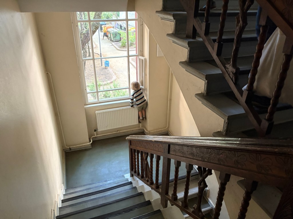 Hier schaffen wir nochmal ein paar Sätze, allerdings muss auch dem großen Kind erklärt werden, dass es nicht die Treppe runterfahren soll und der kleinen Kind, dass der Wasserschlauch vom Nachbarhaus nicht zur freien Verfügung steht. Das große Kind fährt dann trotzdem ein paar Stufen, denn das noch größere Nachbarskind macht es ja entgegen der Anweisung seiner Mutter auch. Geht aber alles gut. Die Kinder am Ende wieder zusammen zu bringen, die Räder und den Buggy anzuschließen und die vier Stockwerke hoch zu laufen dauert dann gefühlt auch nochmal eine halbe Stunde und viel Zureden, denn ab jedem Fenster kann man rausgucken und den Hund beobachten, der unten einen Ball apportiert.