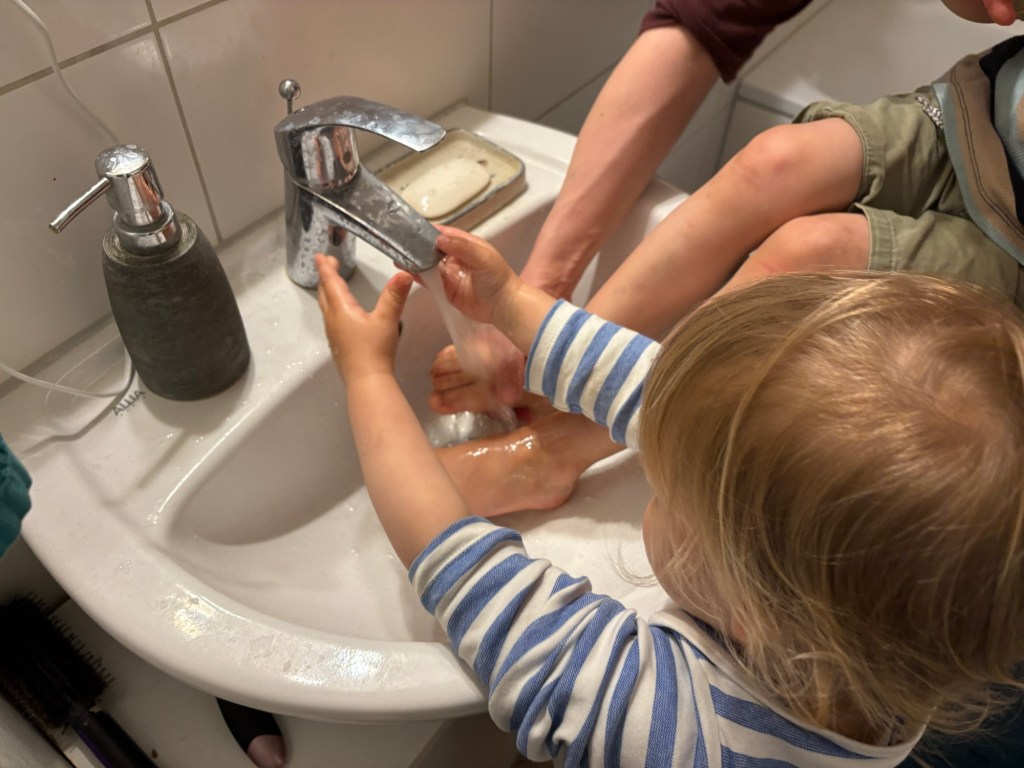 Nach dem Essen wird gekuschelt und vorgelesen, also zwei Kinder hocken auf mir, während ich mich durch Wimmelbücher, Liederbücher und ein Buch über Busfahrer arbeite. Ich werde schon ganz müde, die Kinder lassen sich erst nach und nach etwas anmerken und werden dann in Schichten bettfertig gemacht. Das große Kind verabschiedet sich als erstes und wird von Mama ins Bett gebracht. Das kleine Kind macht noch Mittagsschlaf in der Kita und braucht noch einen Moment mit Papa auf der Couch. Um 20 Uhr ist dann Schichtwechsel bei den Eltern (das große Kind ist auch noch wach), ich verabschiede mich auch vom kleinen Kind und mache mich auf den Heimweg, sonst wird das nix mit der Nachtruhe.
