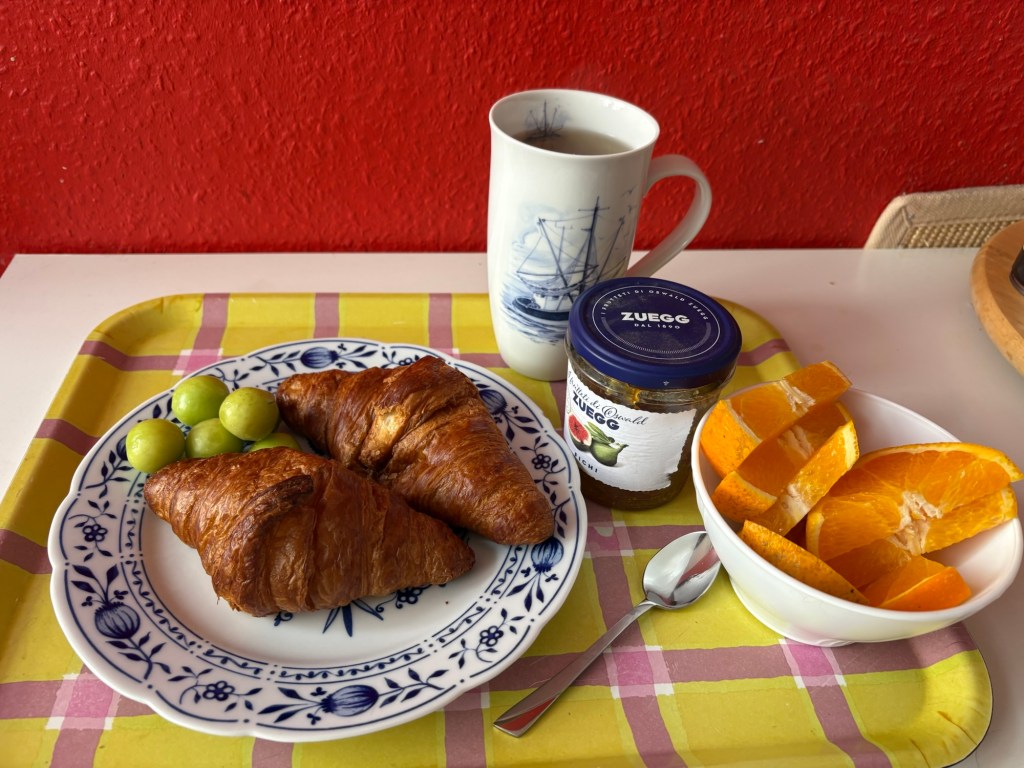 Beim Aufwachen (nach unruhiger Nacht und lange vor dem Wecker) steckt mir die Woche in den Knochen, das waren jetzt vier Tage voller Programm. Und vor mir liegen dann nochmal doppelt so viele. Heute aber gibt es fast keine Termine, also bleibe ich erstmal ganz ohne schlechtes Gewissen liegen, zumindest bis gegen 9 das letzte Geschenk fürs Teilzeitkind geliefert wird. Und danach dann wieder. Erst gegen 11 schäle ich mich aus dem Bett (nach Internet leer lesen, bloggen, mit dem Liebsten telefonieren, Französisch, Italienisch, Rätseln) und mache mir ein mediterranes Frühstück, das mangels Sonne bei 13 Grad dann doch drinnen verzehrt wird.