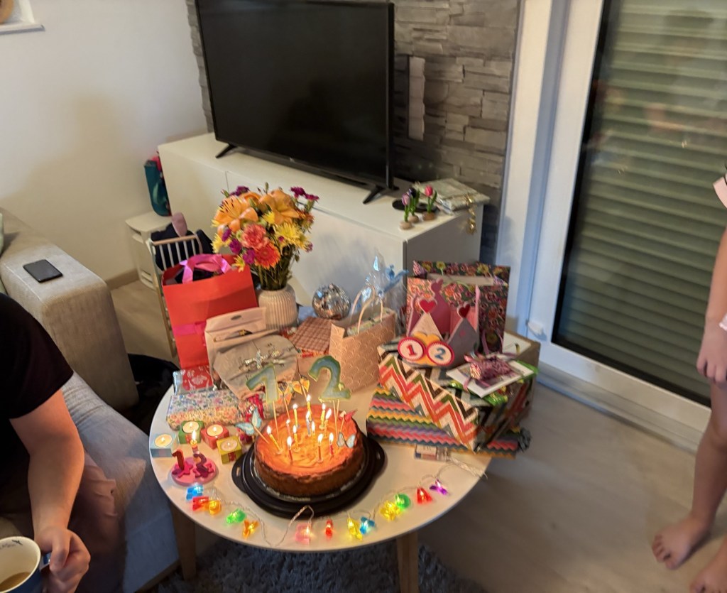 Wobei, jetzt nicht mehr. Gegen 7 geht unten das Geschnatter wieder los und irgendwann gesellt sich auch das größere der beiden kleinen Kinder dazu. Der Liebste und der Geschwisterpapa werden dann auch wach und so geht es für alle irgendwann nach unten, nur das kleine (bald mittlere) Geschwisterkind schläft und schläft und schläft. Erstmal Kaffee für die Erwachsenen. Die Kinder verlegen ihr „Wahrheit-oder-Pflicht“-Spiel nach oben, während wir unten Partyreste verräumen, den Geburtstagstisch finalisieren und Brötchen aufbacken. Als die Kerzen brennen, dürfen die Kinder wieder runterkommen. Wir singen nochmal und dann packt das Teilzeitkind eine knappe Stunde lang Geschenke aus und kommentiert wahlweise mit „Oh mein Gott, [xxx]“, „Wie süüüüüß!“ oder „Das kenne ich, das ist ja toll!“. Zwischendurch rufen die Teilzeitkindmama und die Oma an und gratulieren nochmal offiziell und werden mit Dankesworten für die Geschenke belegt.