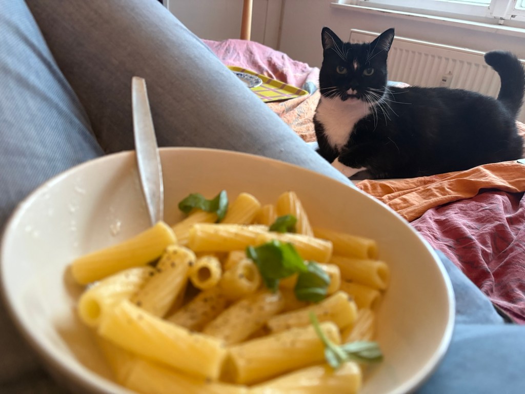 Damit geht es dann aufs Bett, genug bewegt für heute! Kurzer Check-In mit dem Liebsten, der die Muffins fertig hat und dann mache ich endlich Französisch und Italieniscb und gucke mir erschöpft Quatsch im Internet an. Später kommen Bilder vom Stammitaliener und noch mehr Geschenken und Extra-Desserts mit Kerzen drin für das glückliche Teilzeitkind. Ich kriege Hunger und mache mir noch eine schnelle Pasta „Alfredo“, also mit Butter und Parmesan.