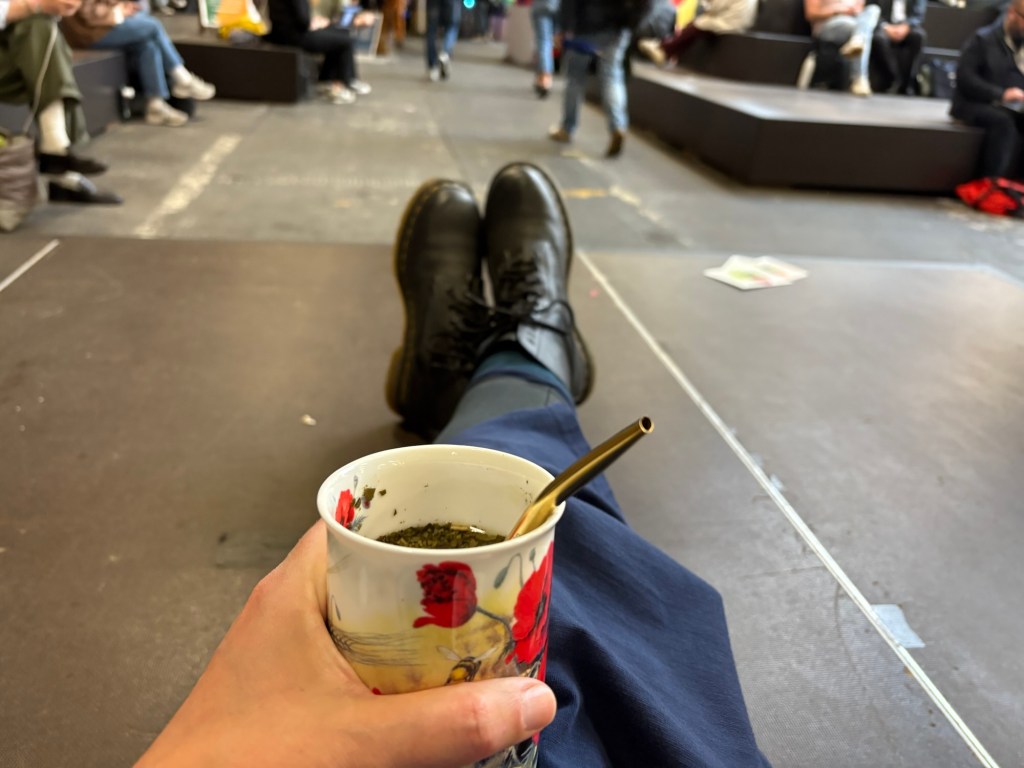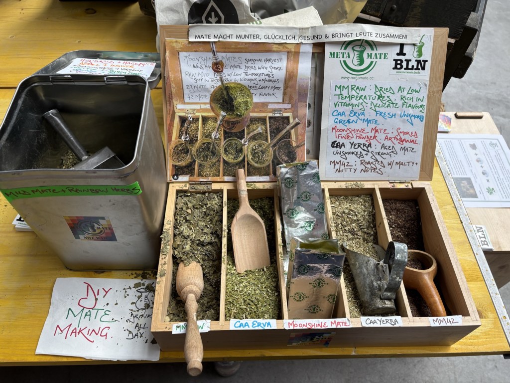 Als ich wieder rauskomme, entdecke ich, dass es im Makerspace wieder Mate zu verkosten gibt. Damit habe ich vor Jahren (2018 oder 2019?) schonmal gute Erfahrungen gemacht. Ich mache mir eine Tasse und darf sie immer wieder auffüllen – das mache ich im Laufe des Nachmittags dreimal. Erst aber setze ich mich damit ein bisschen hin und lege den Fuß hoch, der an Tag 3 mit viel Herumlaufen jetzt doch anfängt, zu schmerzen.