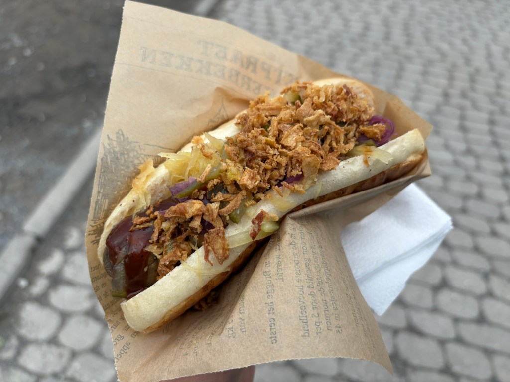 Zwischendurch kommt auch die Sonne kurz raus, so dass ich nochmal im Hinterhof stehe und mich aufwärme. Bei der Gelegenheit hole ich mir gleich noch den veganen Brat Dog zum Mittagessen, der OK ist, aber auch nicht mehr und nicht so lange satt macht wie die Mittagessen an den vorherigen Tagen. In der Schlange komme ich mit einer anderen Besucherin ins Gespräch, weil der Verkäufer uns beide siezt, was nicht zum (gefühlten) Altersunterschied passt (Die vor uns wurden geduzt!). Kontakte knüpfen, so wichtig!
