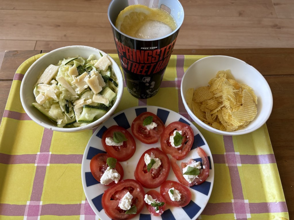 Das macht natürlich auch irgendwann Hunger und so widme ich mich dem Zucchino des Tages auf italienische Art – als Salat mit Zitrone und Parmesan, dazu eine sehr reife Tomate mit Ricotta und Basilikum, viel gutes Olivenöl, ordentlich Salz wegen der Hitze (daher auch der Rest Chips).