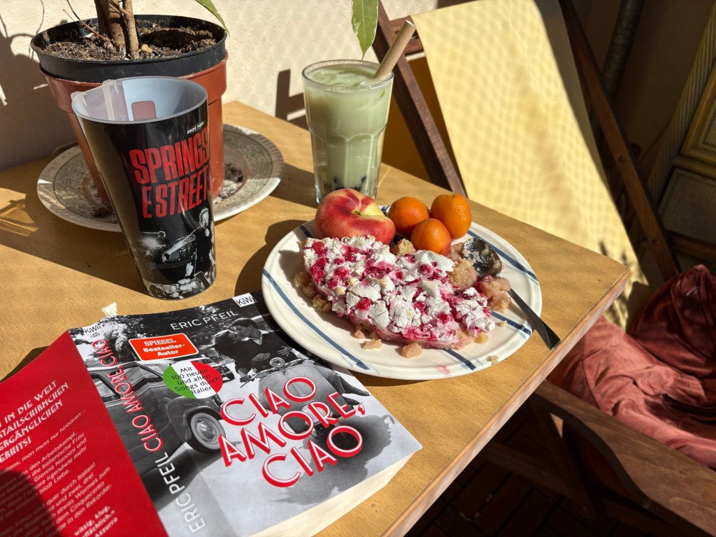Nach dem Frühstück noch Sprachen und Rätsel und dann wechsle ich vom Tisch in den schattigeren Teil des Balkons, mache den Liegestuhl so flach wie möglich und halte es so noch etwas länger als gestern draußen aus. Gegen 11 wird es auch so zu warm und ich lege mich zum Weiterlesen drinnen aufs Bett, mit dem Ventilator an. Das führt dazu, dass ich immer mal wieder einnicke, aber das passt ja zum Urlaubsgefühl. Irgendwann wird es mir dann aber zu bunt – ich stehe wieder auf, schütte mir kaltes Wasser ins Gesicht und setze mich auf die Couch. Dazu wieder Orangensaft-Ginger-Orangenblütenwasser auf viel Eis und weiter mit dem Italo Pop. Ich höre jeweils das besprochene Lied zum Kapitel parallel auf Spotify, arbeite mich so akribisch durch die zweite Hälfte des Buches und lerne immer mehr über Italien.