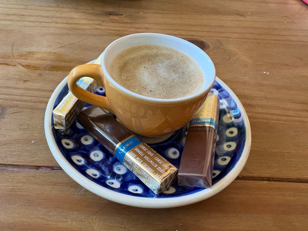 Als ich am späten Nachmittag mit dem Buch durch bin, mache ich dann doch noch etwas halbwegs Produktives und räume meinen Geburtstagsgabentisch auf, sortiere die Geschenke weg – das meiste landet in der Küche oder auf dem Bücherstapel auf dem Nachttisch – und weihe meine neue gelbe Moka ein (die für 3 Tassen, meine für 2 Tassen reicht nicht wirklich, wenn der Liebste da ist, die für 6 Tassen ist zu groß für nur uns Zwei). Einmal gründlich mit warmem Wasser ausspülen, dann zweimal Kaffee kochen und wegkippen. Die dritte Brühung dann trinke ich mit ein wenig Erbsenmilchschaum und der aktuellen Merci-Sommerkollektion, um nochmal etwas wacher zu werden.