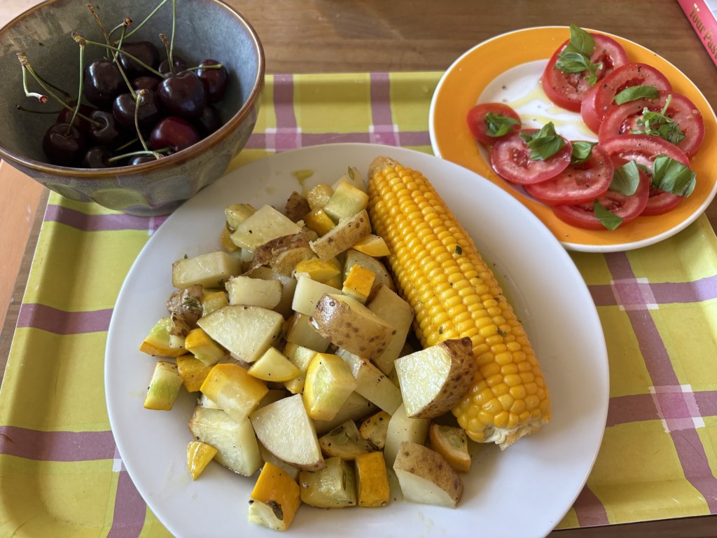 Und schwups ist Abendbrotzeit. Der Zucchino of the day (der letzte der Fünf!) wandert zusammen mit einer großen Kartoffel und Thymian in den Backofen, dazu koche ich einen Zuckermaiskolben und schneide die letzte Crowdfarming-Tomate klein.