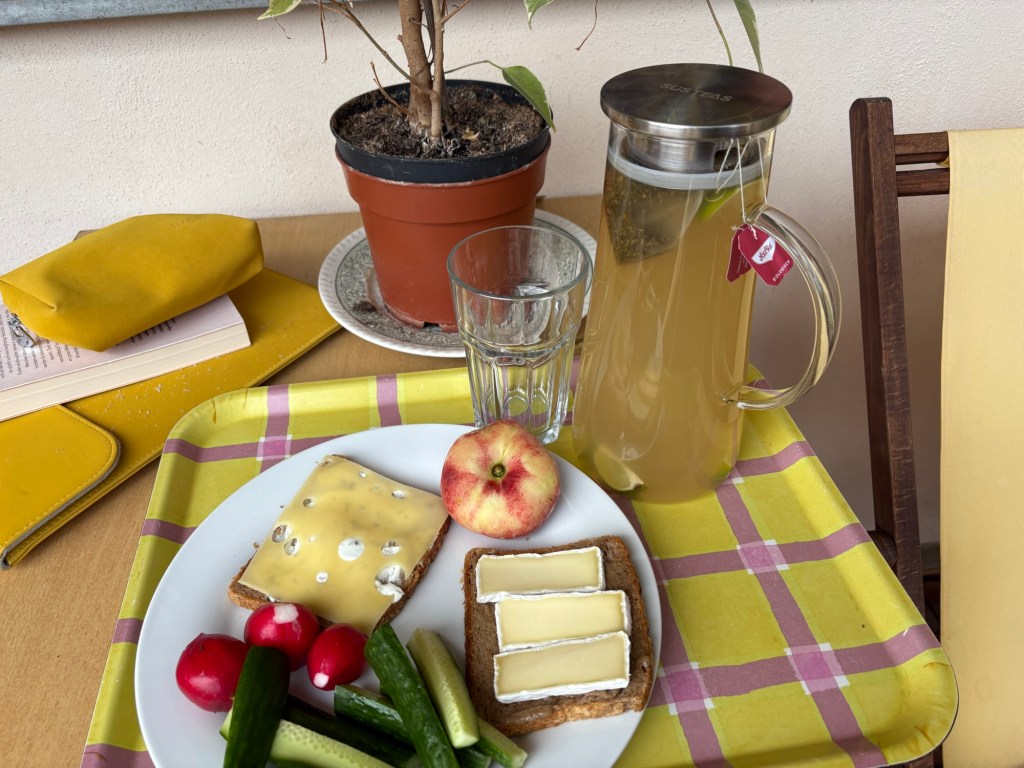 Mit U-Bahn und Tram geht es dann zurück nach Hause. Erstmal alles auspacken und dann Mittag. Es gibt zwei Sorten Käsebrote, jeweils mit Unterlage von den Ellis (einmal Steinpilzpaté, einmal Ziegenfrischkäse) und dazu Radieschen, Gurke, Pfirsich und kalten Tee (Weißer Tee mit Aloe Vera, Apfelsaft und Limette).